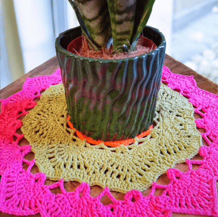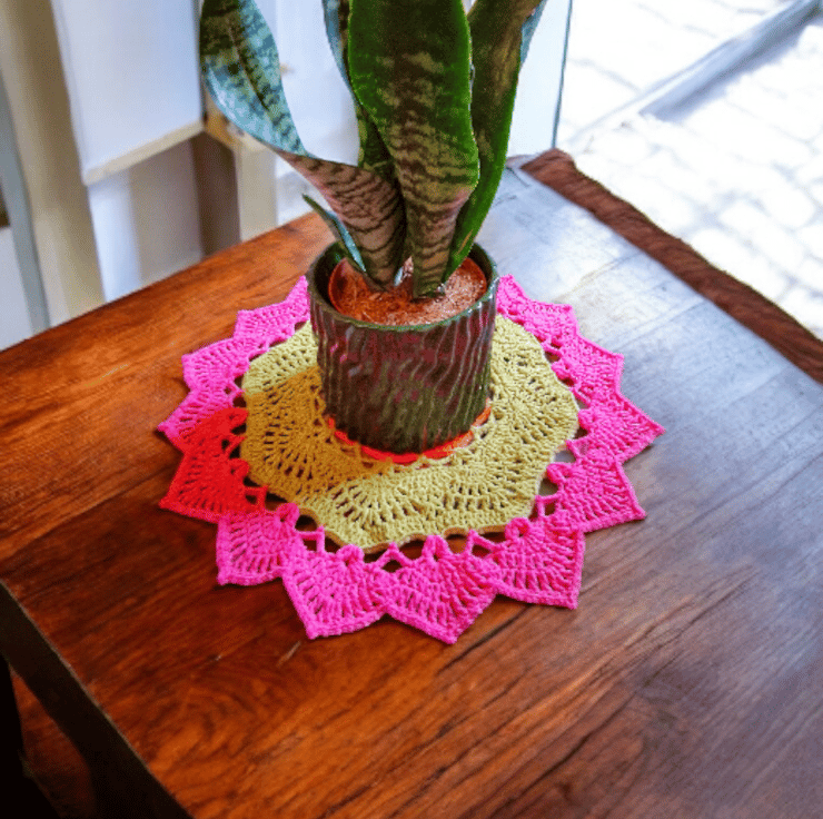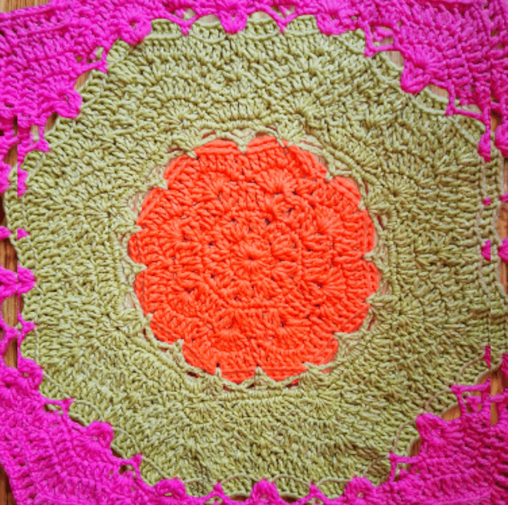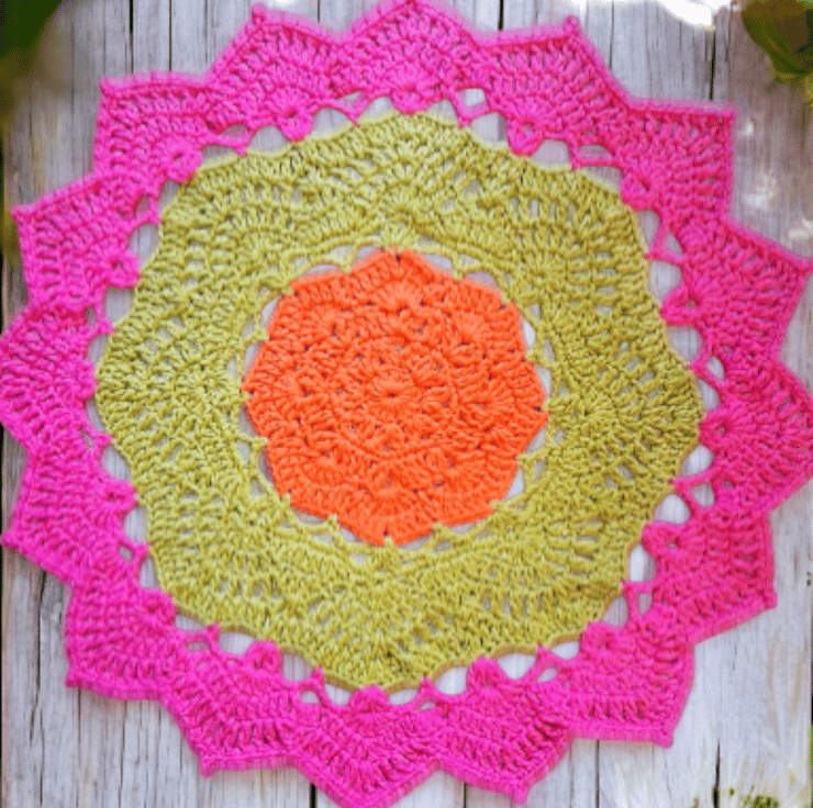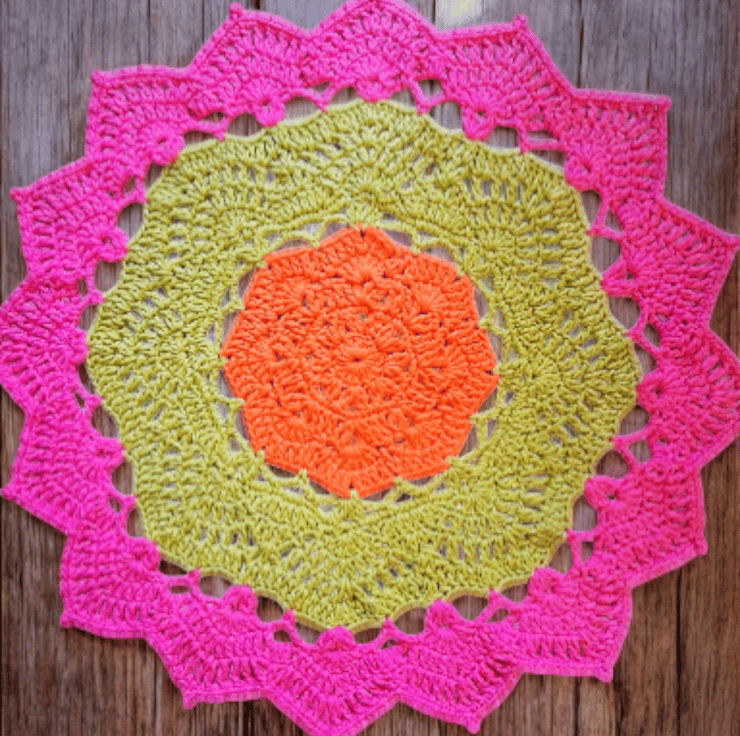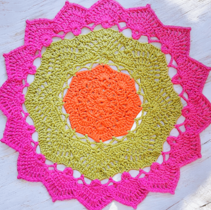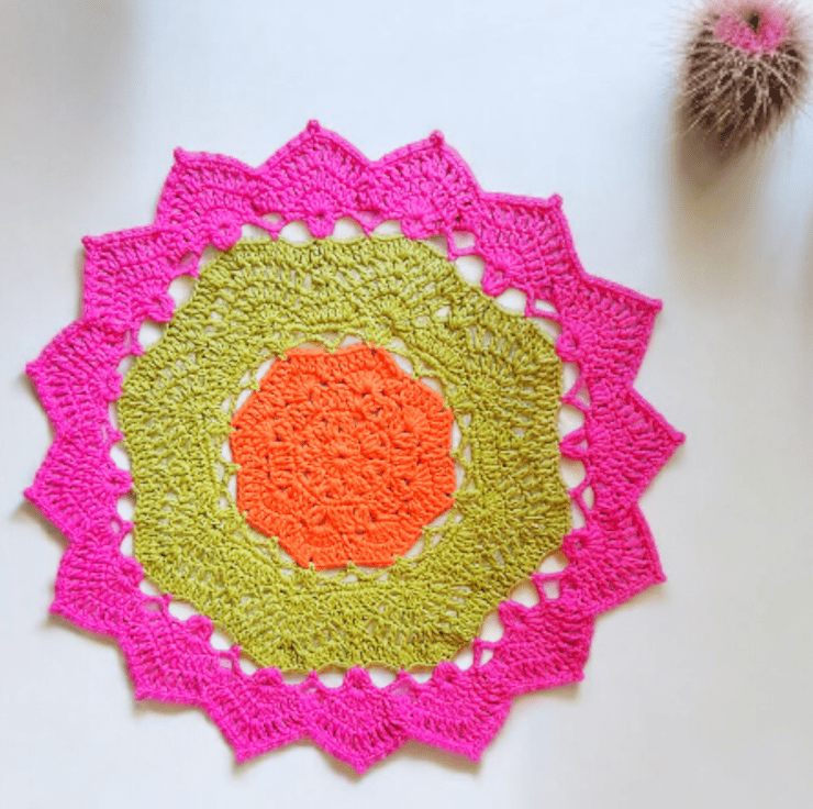Bright mandala table mat / doily. 39 cm diameter. This large doily really is a statement piece, with its bright blocks of colour. Crocheted in a soft cotton blend for colour retention and ease of wash.