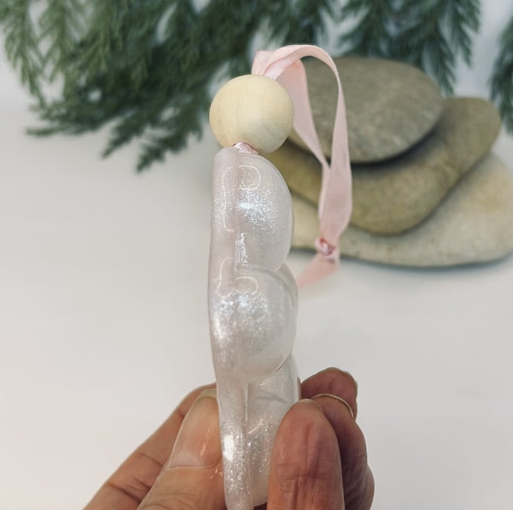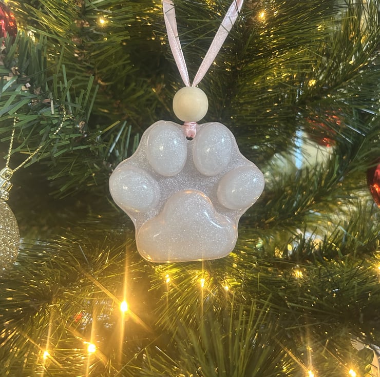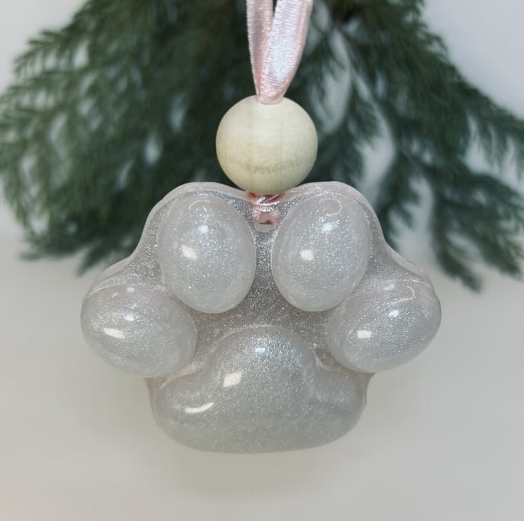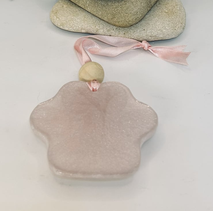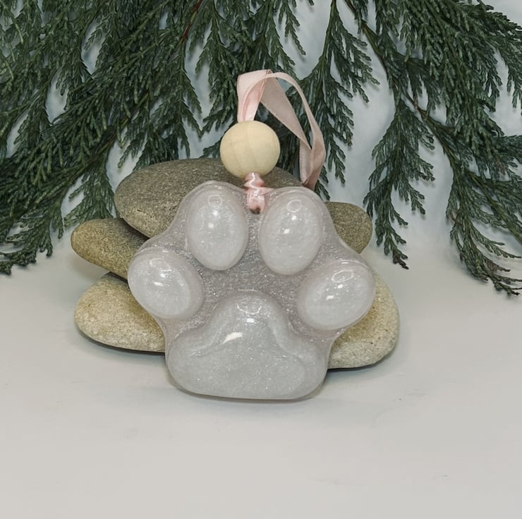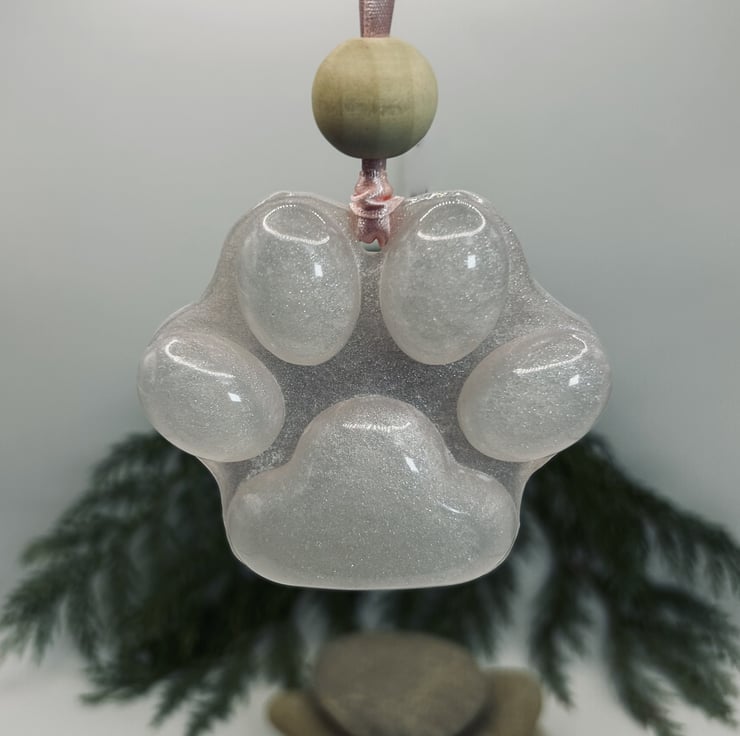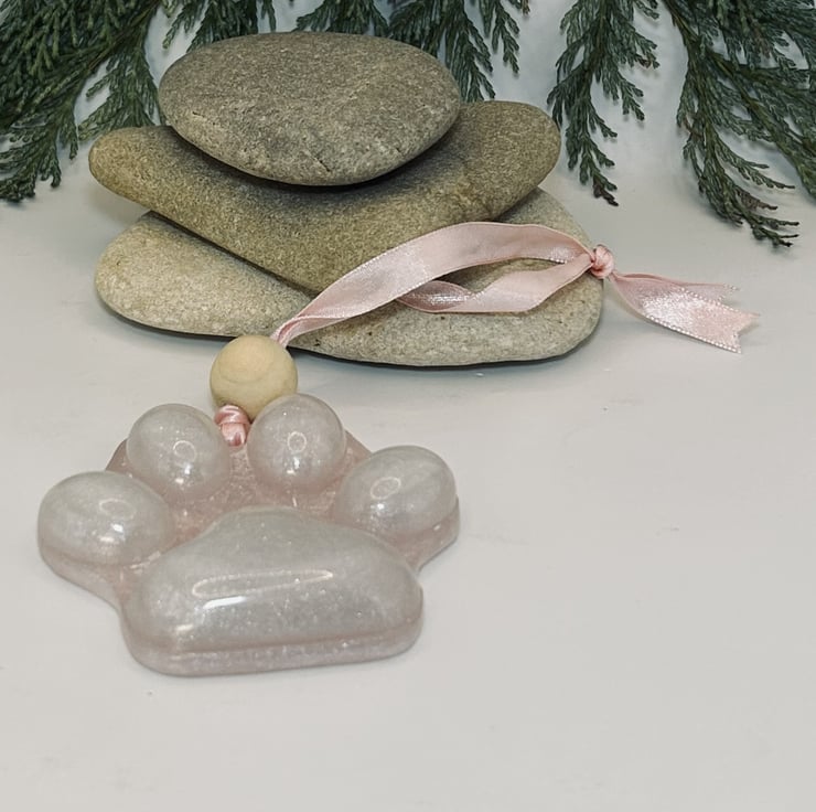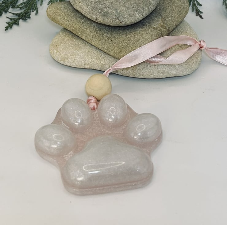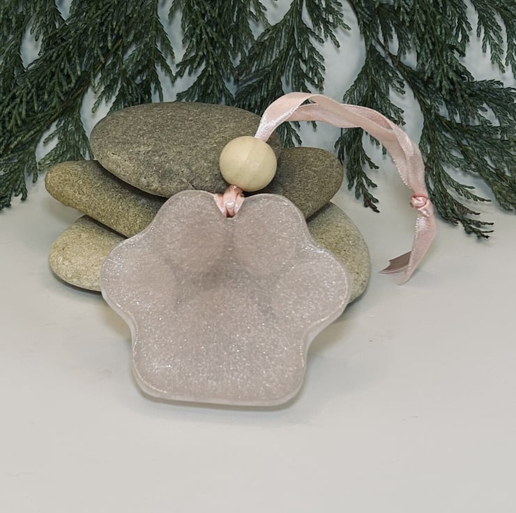 A soft shimmering pink resin paw, finished with a wooden bead and light pink sateen ribbon for hanging. Lovely as a Christmas tree decoration, wall piece or memorial keepsake, it brings gentle sparkle and heartfelt charm.