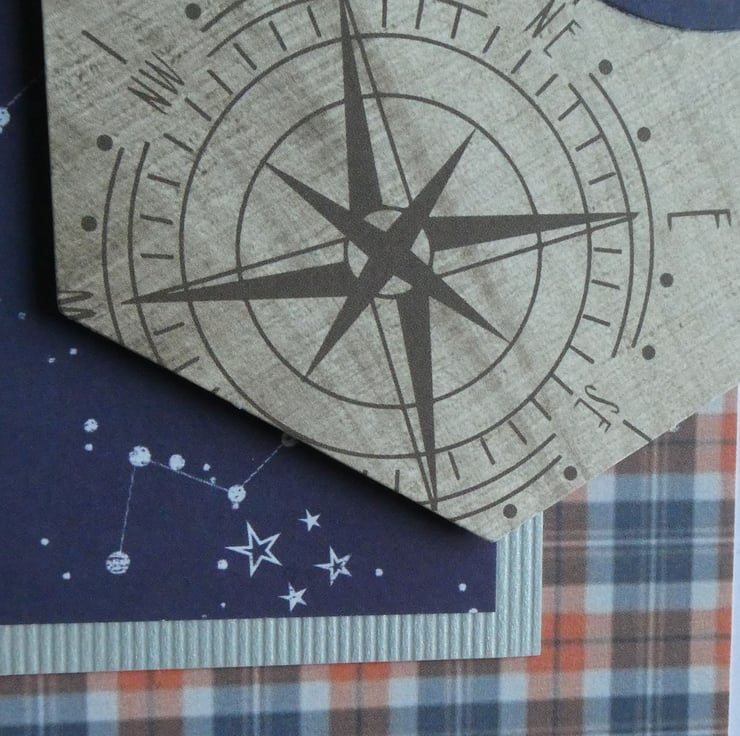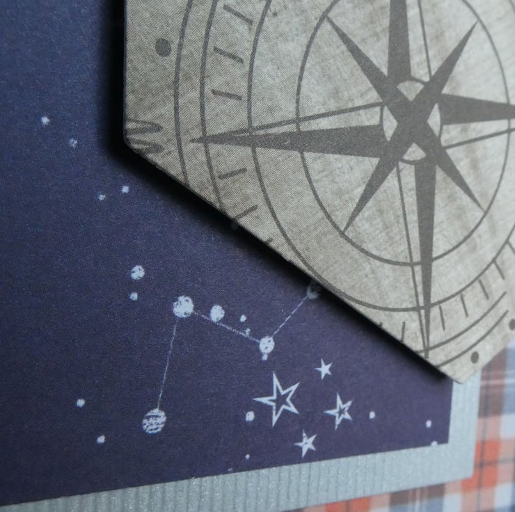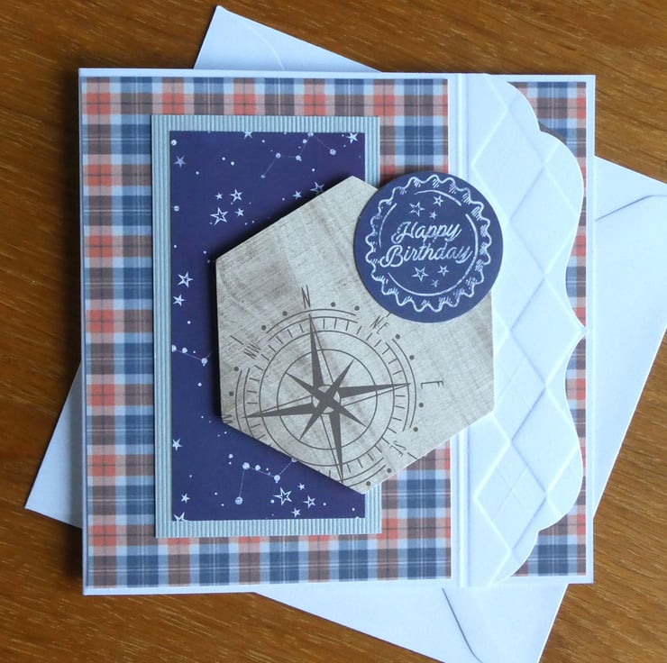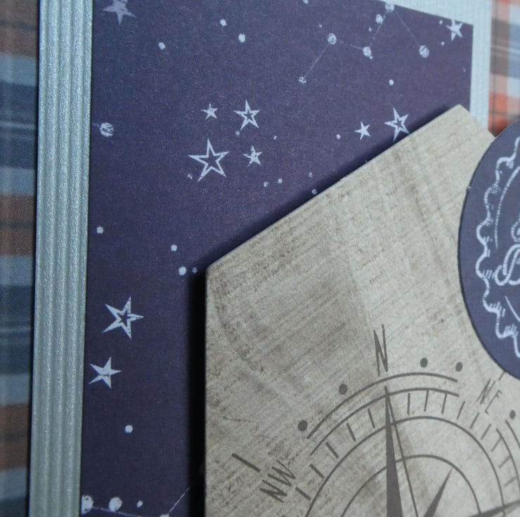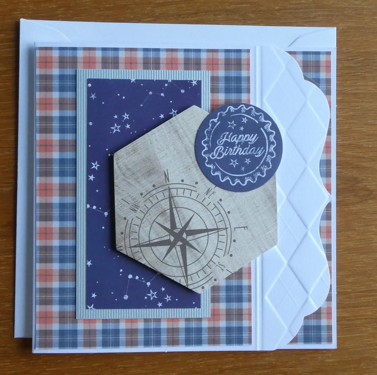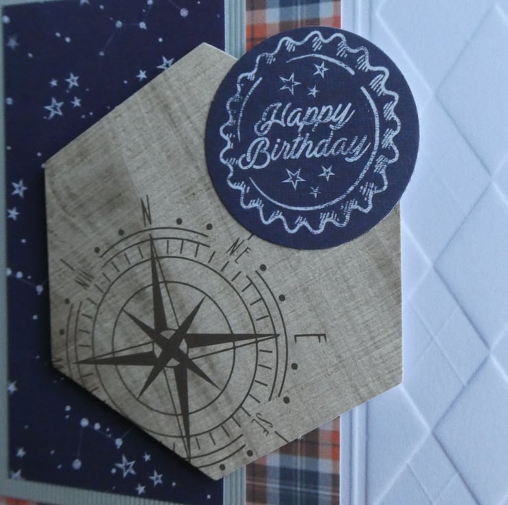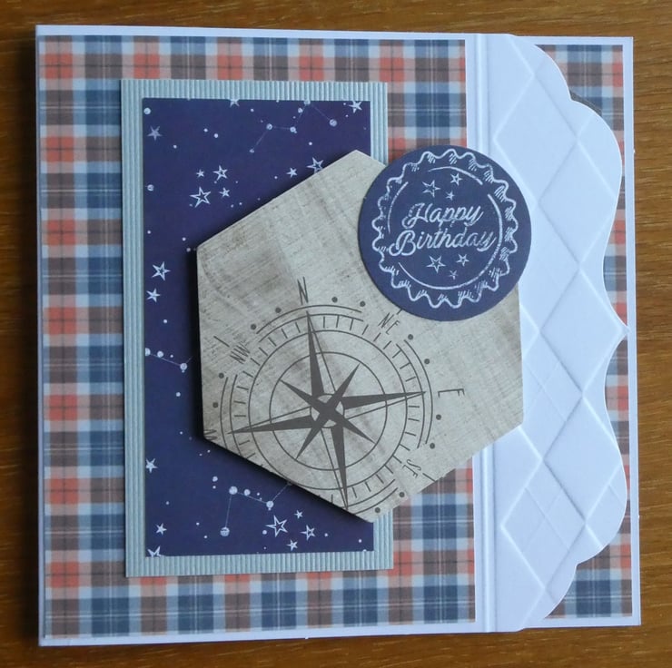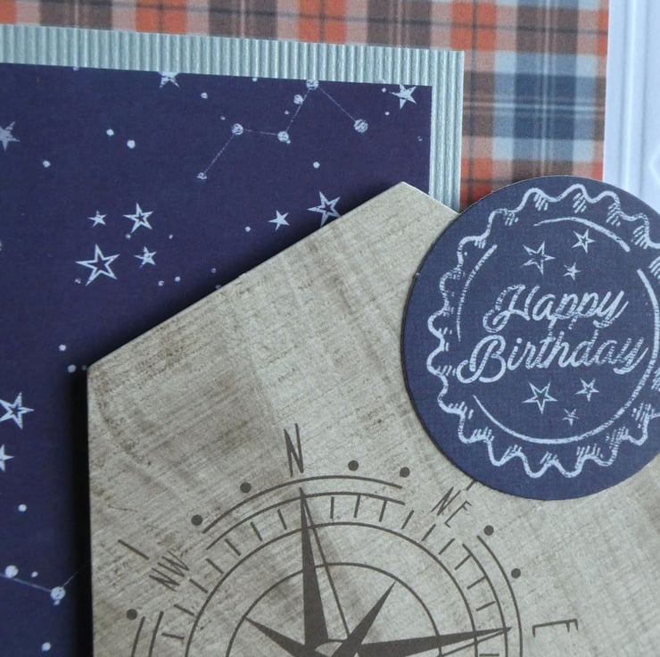 A base layer of orange and blue tartan paper has been overlayed with a silver ridged card and paper with white stars in a dark blue sky. It has been finished with an octagonal topper with a compass design and the greeting Happy Birthday in a white font on a dark blue background.