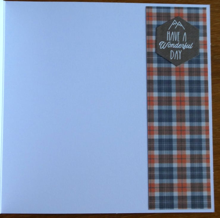 The right hand side of the card has a scalloped edge with an embossed Argyle pattern which has been left white and this is highlighted with a strip of matching tartan paper along the inside edge of the card.