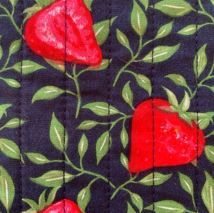 It is made with this lovely strawberry print fabric on a dark blue colour background.