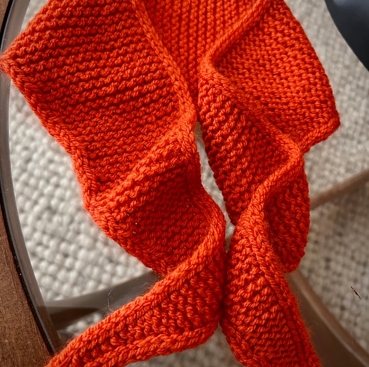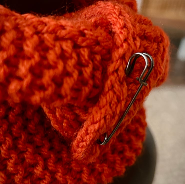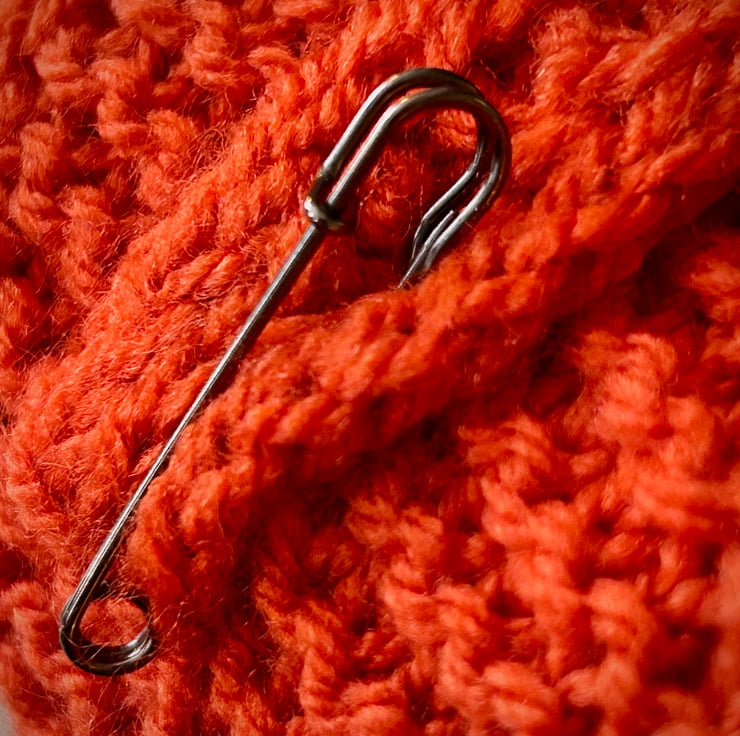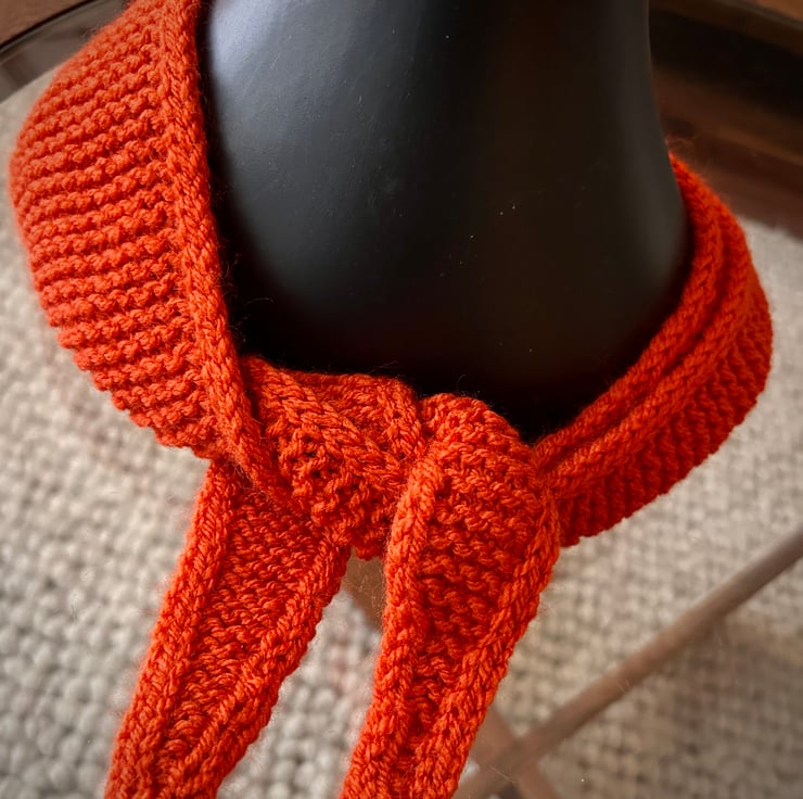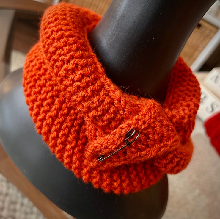 Lovingly hand knitted in a soft rusty copper orange shade, this versatile scarf can be worn with or without the accompanying kilt pin.