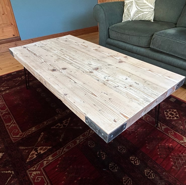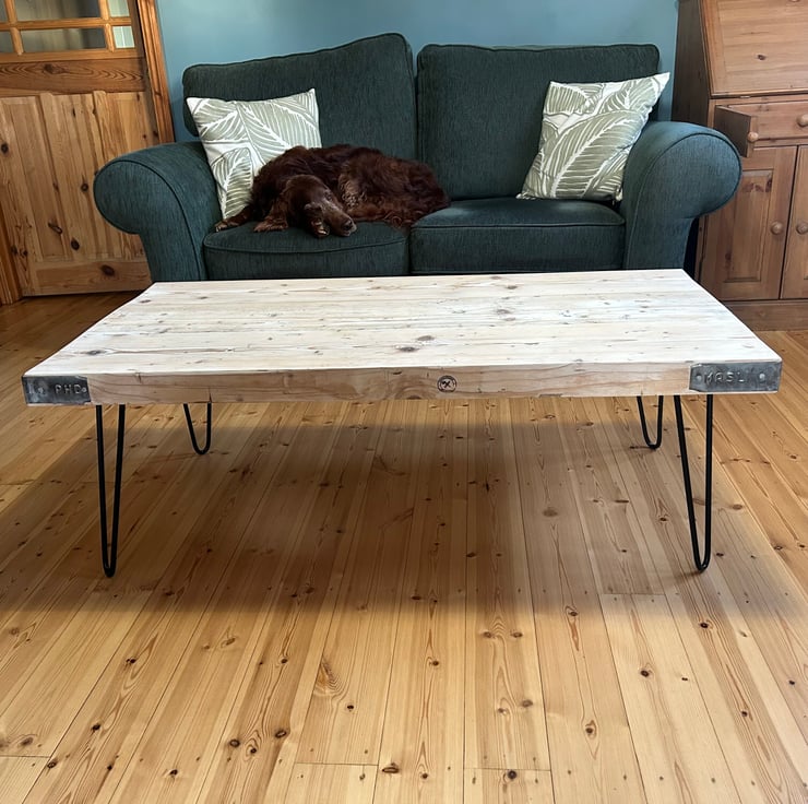 Table is made from reclaimed 25mm scaffolding boards which are sanded and glued together using dowels. The table has then been sanded again to 240grit and finished with Rubio Mono Coat giving it a light Scandinavian look. It also retains the galvanised corner finishes and comes on 350mm hairpin legs. The dimensions of the table are 1200mm long, 620mm wide 45mm thick, it weights 19kg so it’s quite heavy.