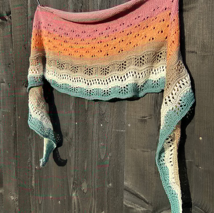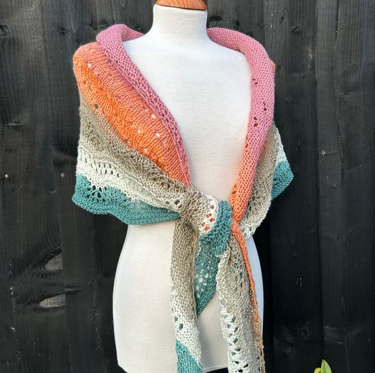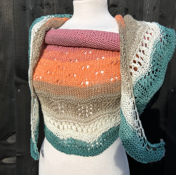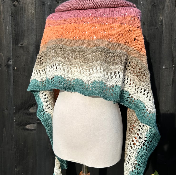 Hand knitted by me in a combination of lace stitches using only 1 yarn cake of 150 grams 20% wool and 80% acrylic
