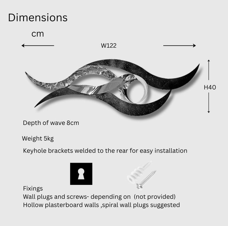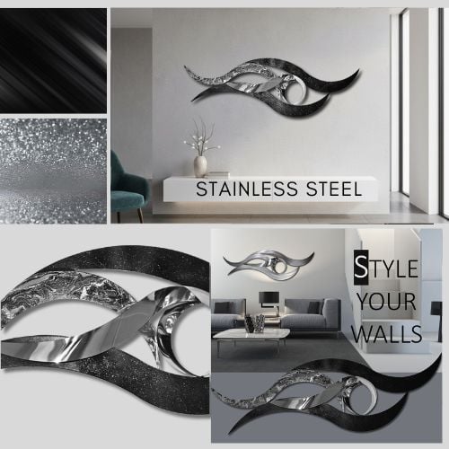 Inspired by the sleek elegance of modern architecture and the mesmerizing movement of ocean waves, this graphite grey sparkle and mirror polished wall sculpture is crafted to capture light and add depth to any space. The interplay of shimmering grey and reflective stainless steel creates a bold yet sophisticated focal point, perfect for lovers of contemporary wall art and unique, handmade metal sculptures.