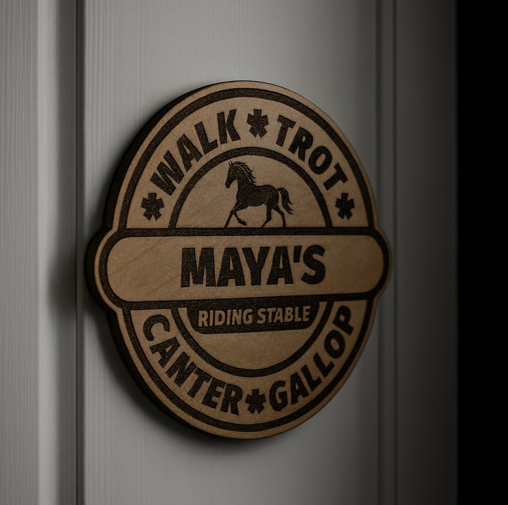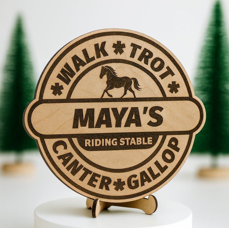 A circler personalised horse stable themed sign that you can put on your wall or on your door or anything vertical.