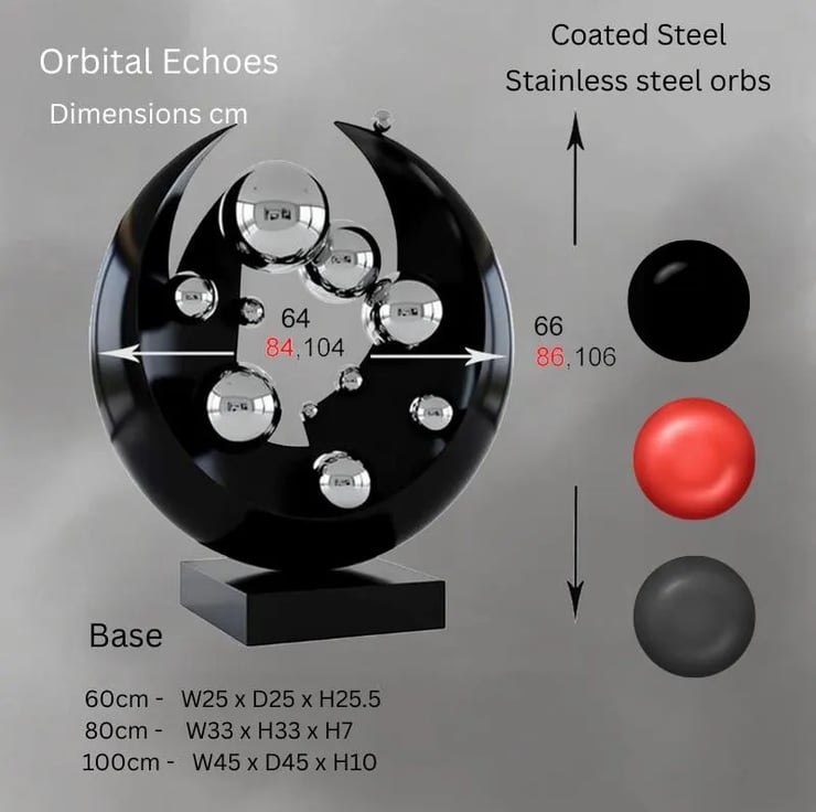 Orbital Echoes is inspired by movement, balance, and the quiet harmony of the cosmos. The circular form represents continuity, while the reflective spheres suggest planets suspended in orbit, captured at a single moment in time.