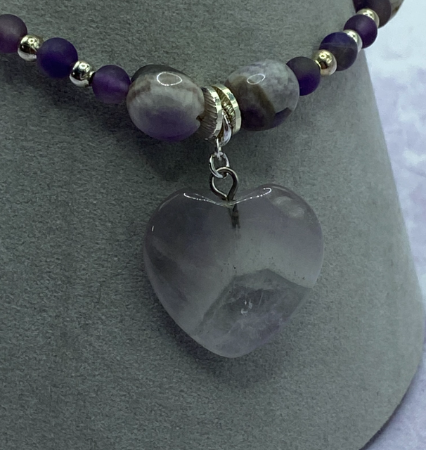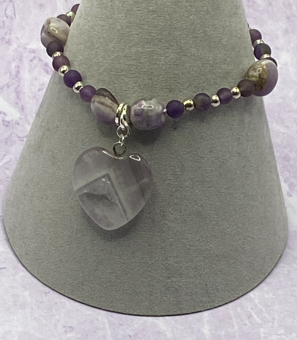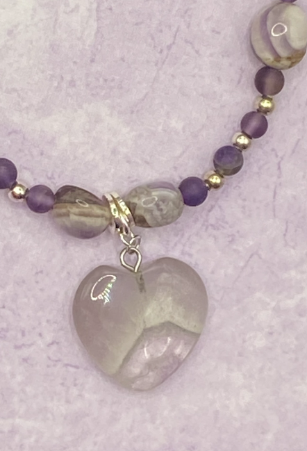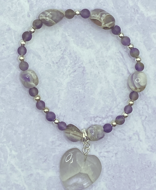 A stretchy bracelet with a mix of amethyst rounds, chevron amethyst nuggets and silver plated spacer beads, finished with a chevron amethyst heart charm