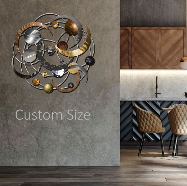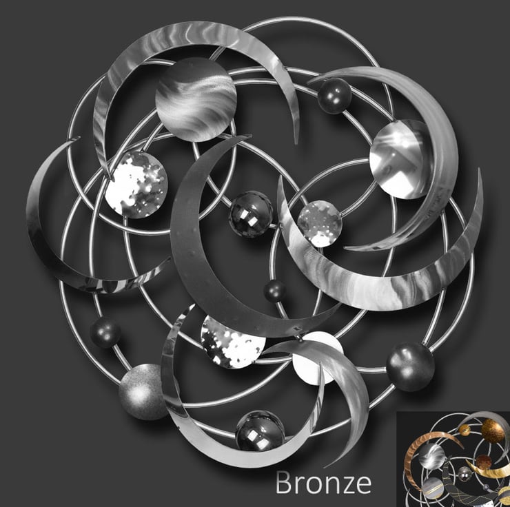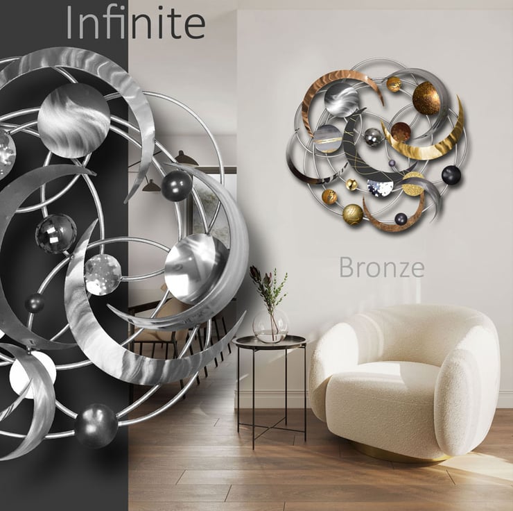 Transform your space with Infinite, a striking stainless steel wall sculpture that brings modern elegance and a sense of serenity to any interior. Crafted from a flowing arrangement of circles, moons, and spheres, this piece evokes balance, movement, and quiet sophistication, making it a captivating focal point for living rooms, hallways, bedrooms, or bathrooms.