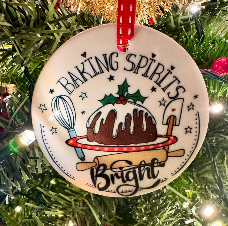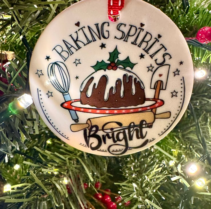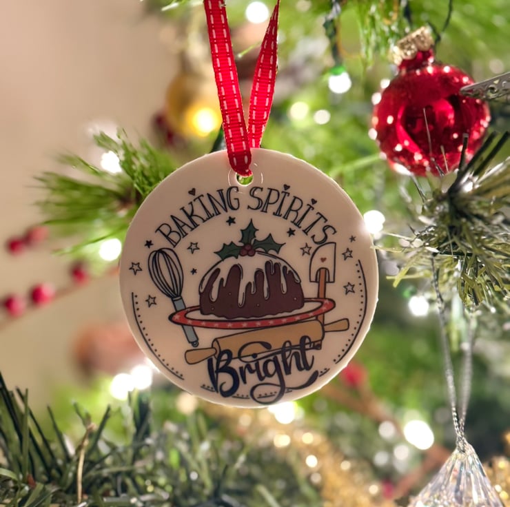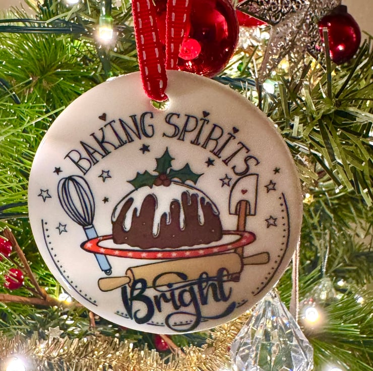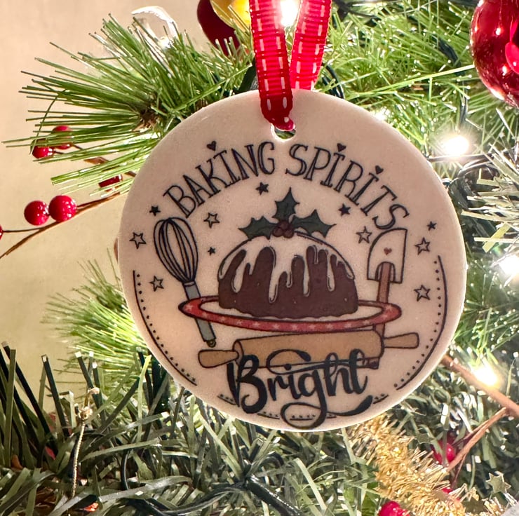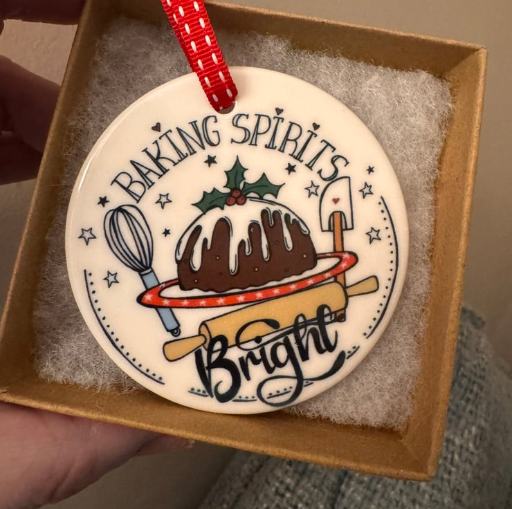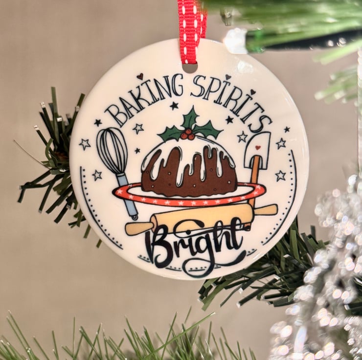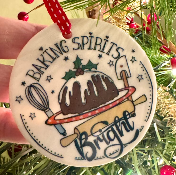 This Ceramic Christmas decoration has been individually printed using my original “Baking Spirits Bright” illustration, having a twist on the line from Jingle bells! “making spirits bright.” It depicts a Christmas Pudding with baking equipment around it, and makes the perfect gift for any one who loves baking.