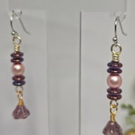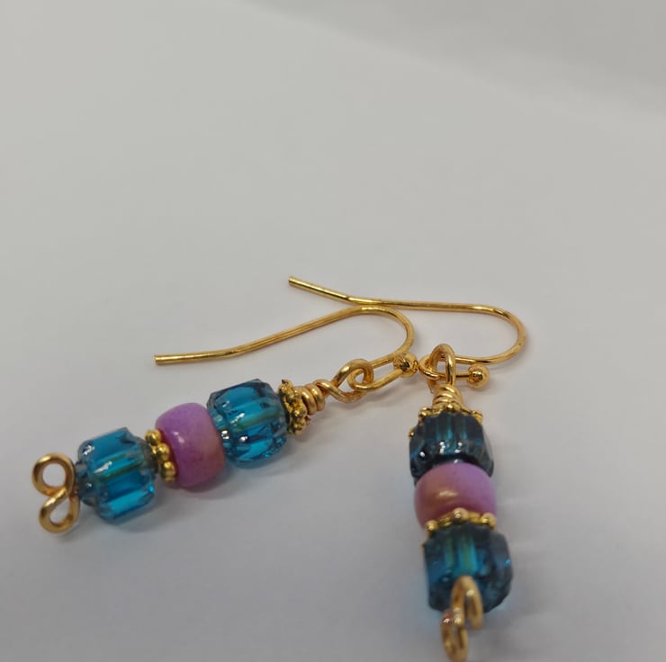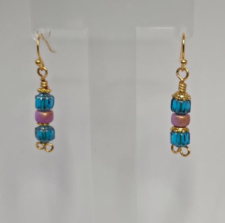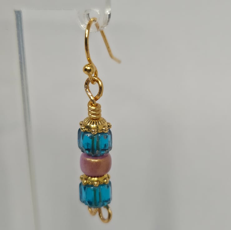 Handmade drop earrings featuring faceted teal-blue glass beads paired with a soft lavender bead accented with a warm golden sheen. Finished with decorative gold-tone spacers and elegant hook ear wires, they offer gentle movement and refined colour.