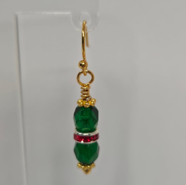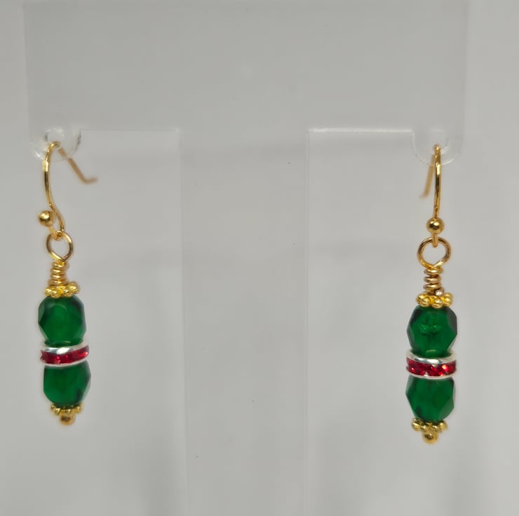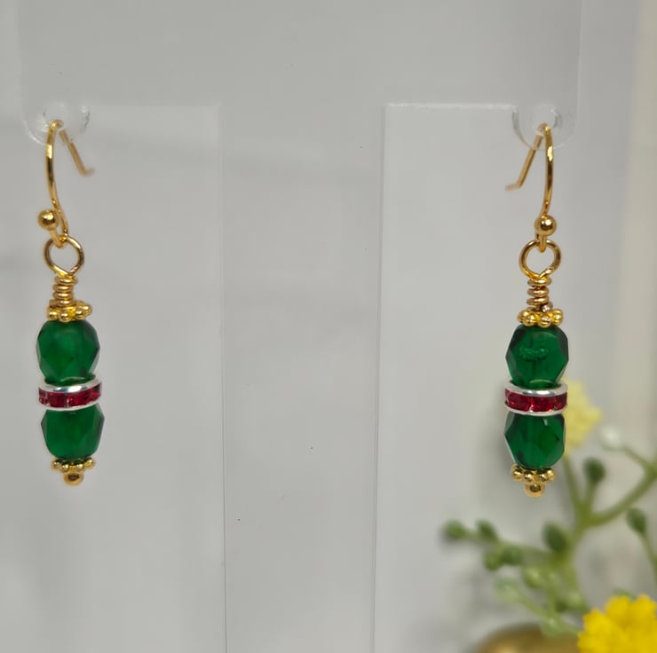 These elegant drop earrings feature deep emerald-green faceted glass beads, beautifully offset with a rich ruby-red crystal spacer and warm gold-tone detailing. The faceted surfaces catch the light with every movement, creating a subtle yet luxurious sparkle.