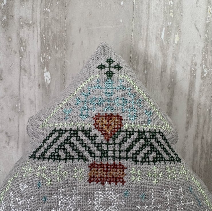 Bowl Filler machine embroidered cross stitch design. Measuring 5.5" x 5". Grey pre washed linen fabric filled with polyester fibrefill. Little pillows of fun. Select 1 or fill a bowl full of Winter colours.