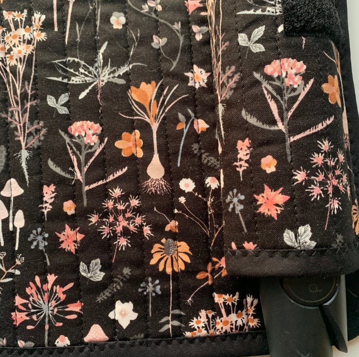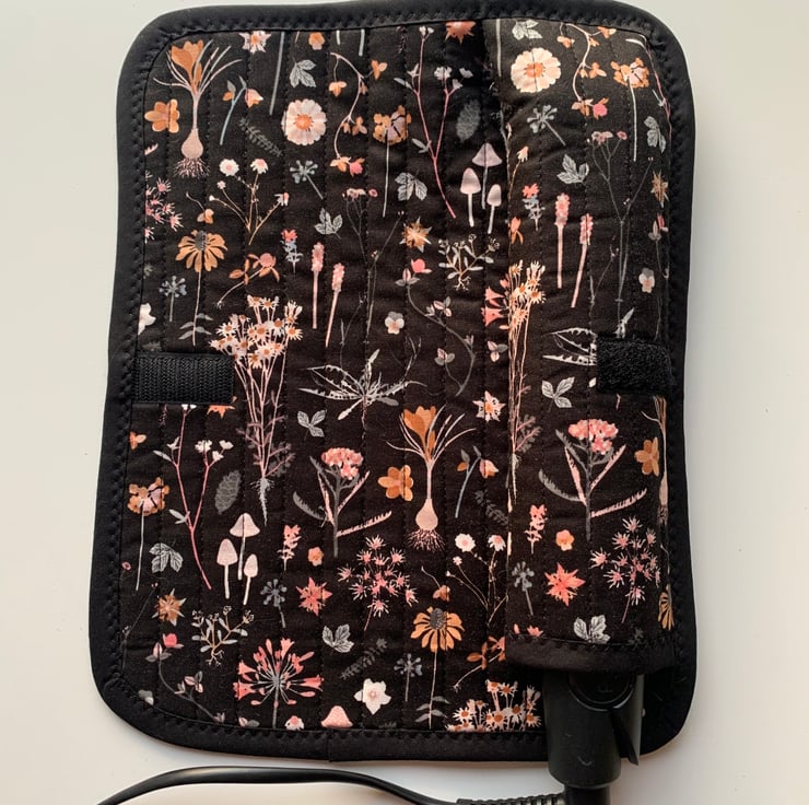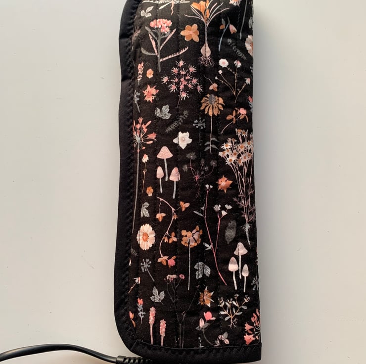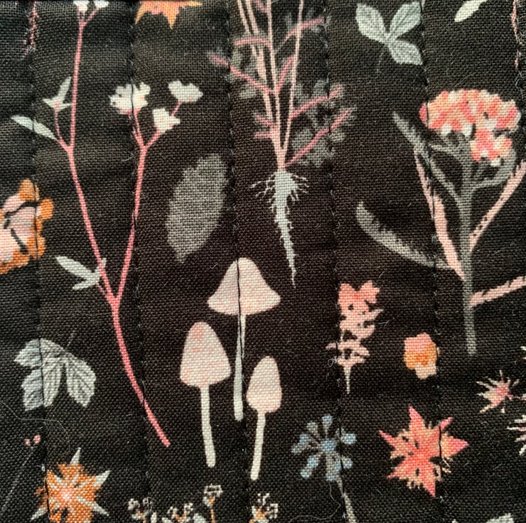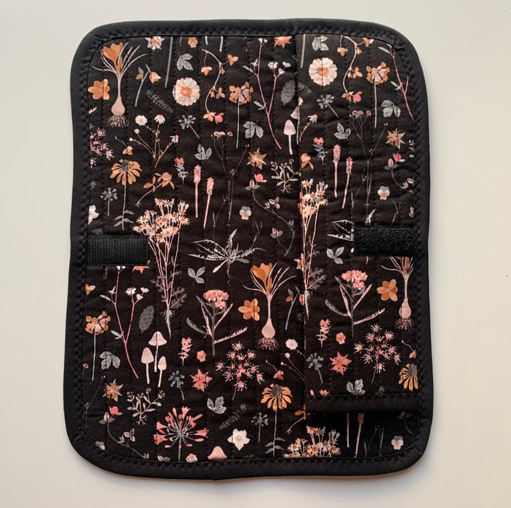 A beautiful mat made with a floral and mushroom print cotton on a black background to use everyday or when travelling. The mat prevents heat damage to surfaces. This is due to the mat and pocket fabric being quilted on to Insulbrite thermal wadding.