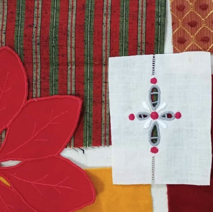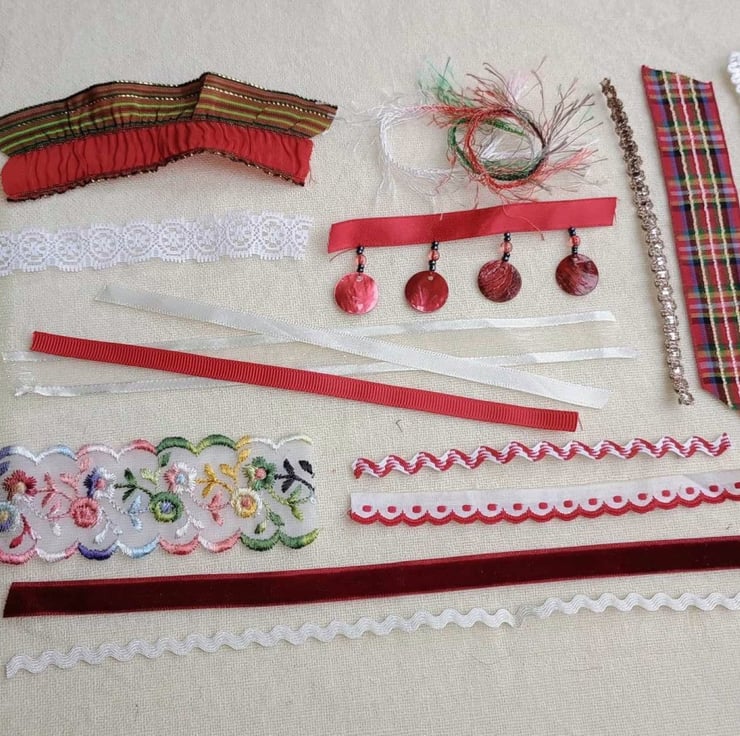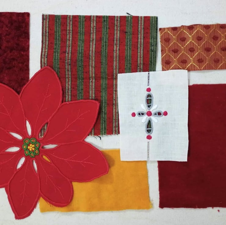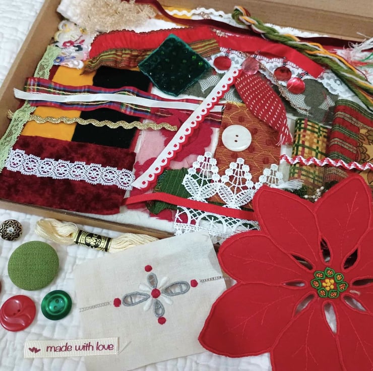 Traditional red, green and gold. My Christmas Red Poinsettia slow stitching kit is full of vintage, pre-loved and factory waste textiles, haberdashery and trims. Ideal for embellishing Christmas clothes or making small craft projects, as well as slow stitching and textile art.