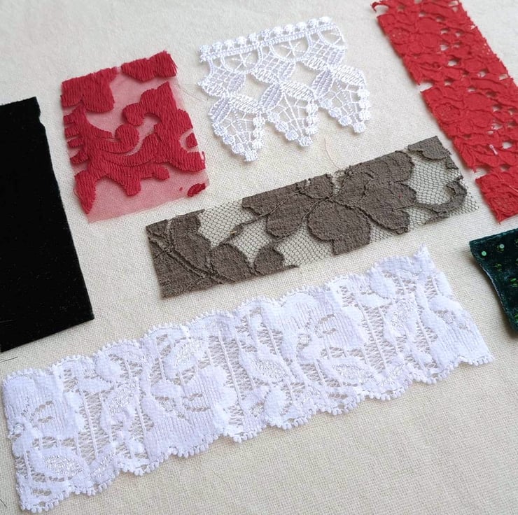 In the box you will find an Introduction to slow stitching and stitch guide, a piece of firm calico fabric as a foundation for stitching onto, and lots of small snippets of vintage or salvaged fabric and haberdashery trims. There is also co-ordinating embroidery threads, and a sewing needle and pins.