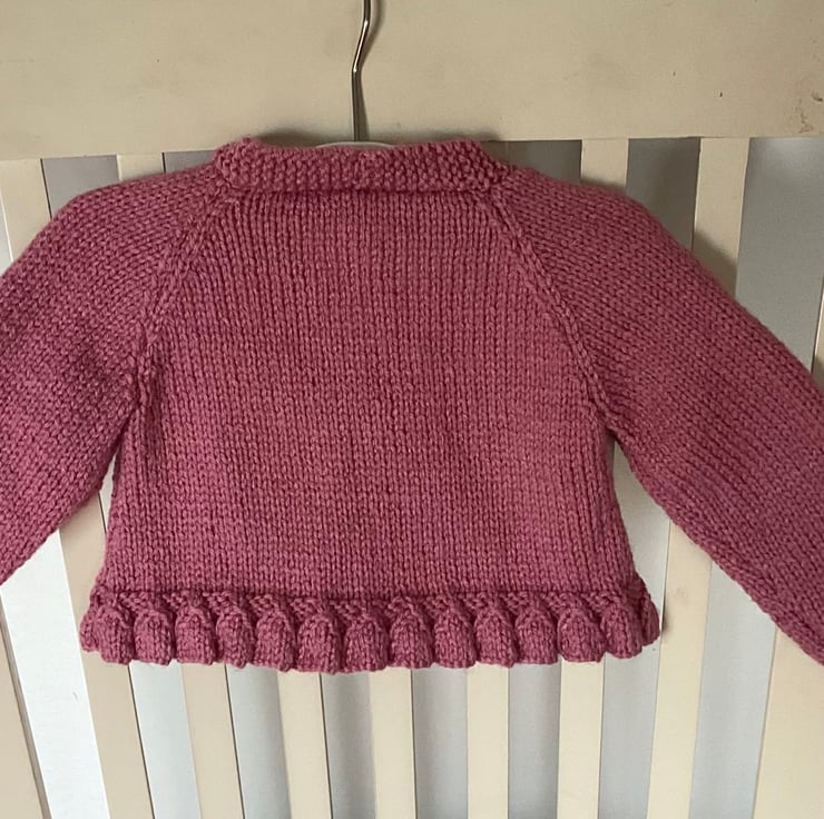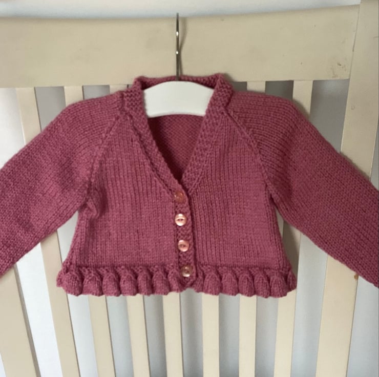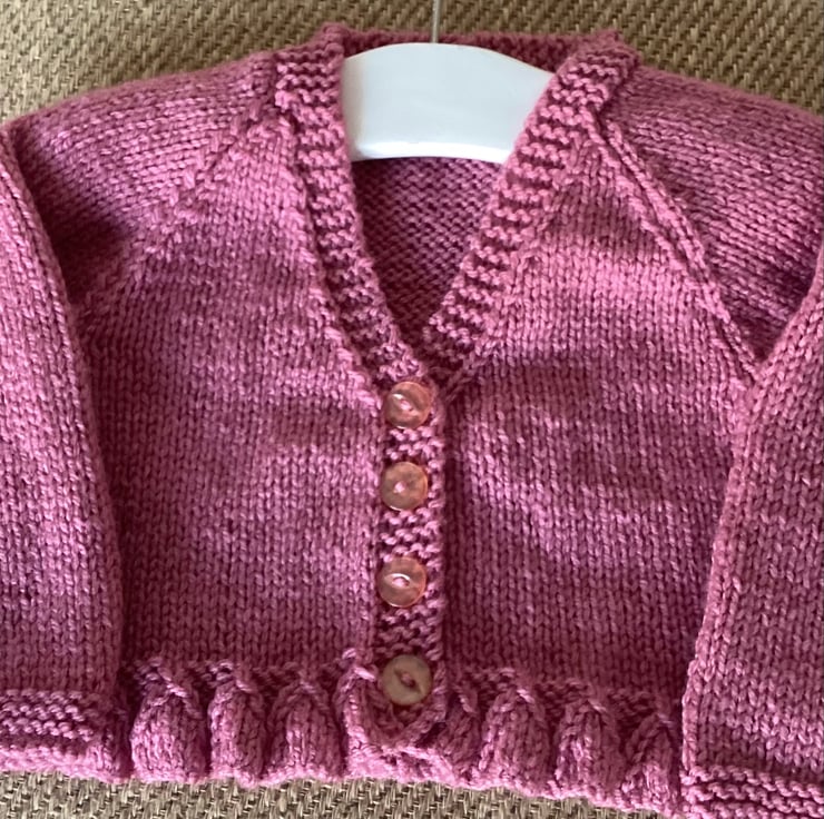 Very sweet little baby cardigan hand knitted by me in my Suffolk home. I have followed a vintage pattern and used a good quality baby yarn in a gorgeous dusky pink colour. Fastens with 4 matching baby buttons. Would make a lovely gift for a new baby.
