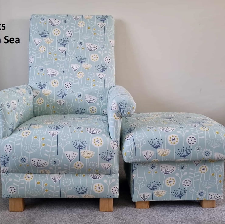 I am offering for sale this gorgeous ADULT'S chair, which has been made myself. I am a professional upholsterer with over 33 years experience, and have made this sturdy chair and matching footstool, using Fryetts Bergen Sea Foam Duck Egg fabric.