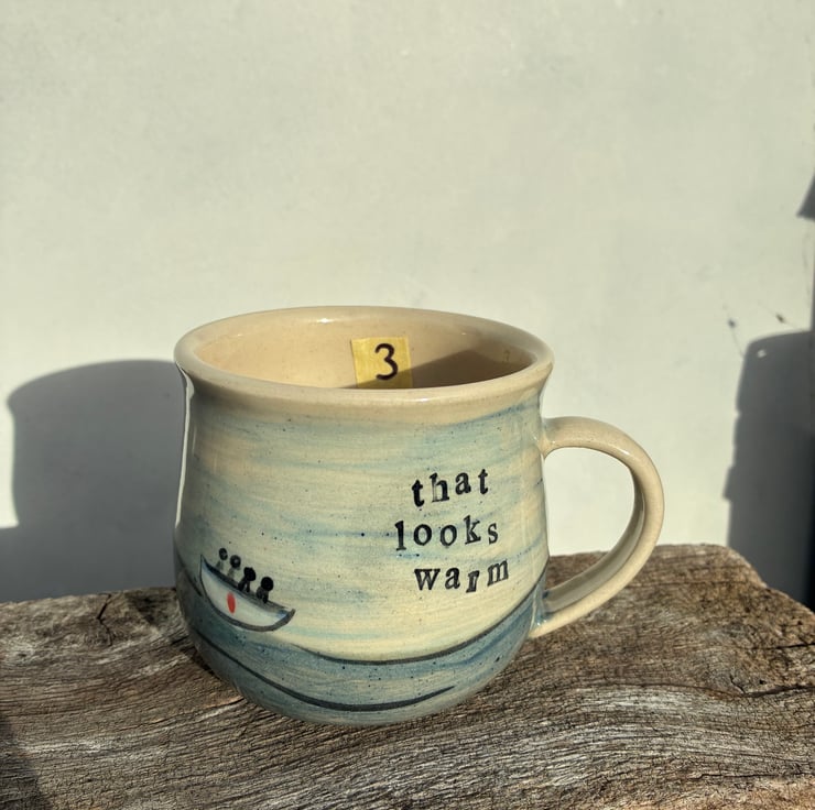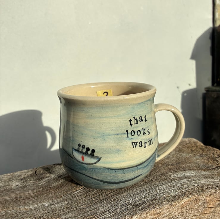 Inspired by an episode of the inbetweeners, this mug has a hand painted seascape with figures in a boat, inlaid lettering on both sides and additional lettering as well as a painted fish inside of the mug.