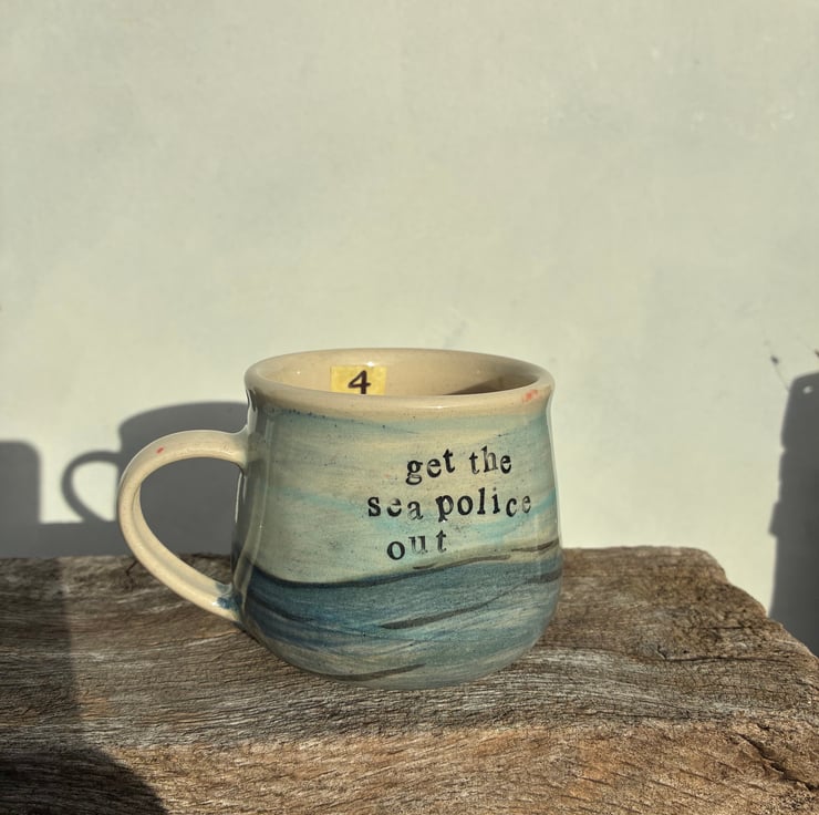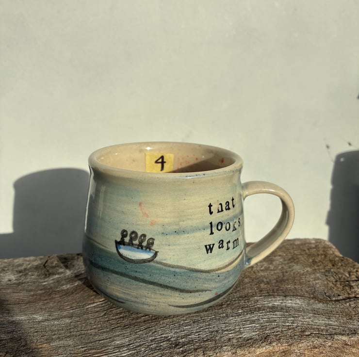 Inspired by an episode of the inbetweeners, this mug has a hand painted seascape with figures in a boat, inlaid lettering on both sides and additional lettering as well as a painted fish inside of the mug.