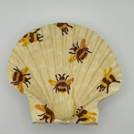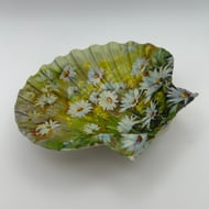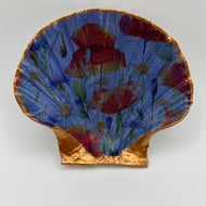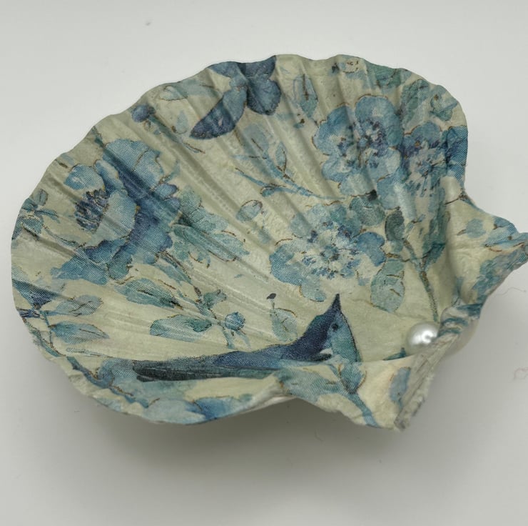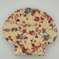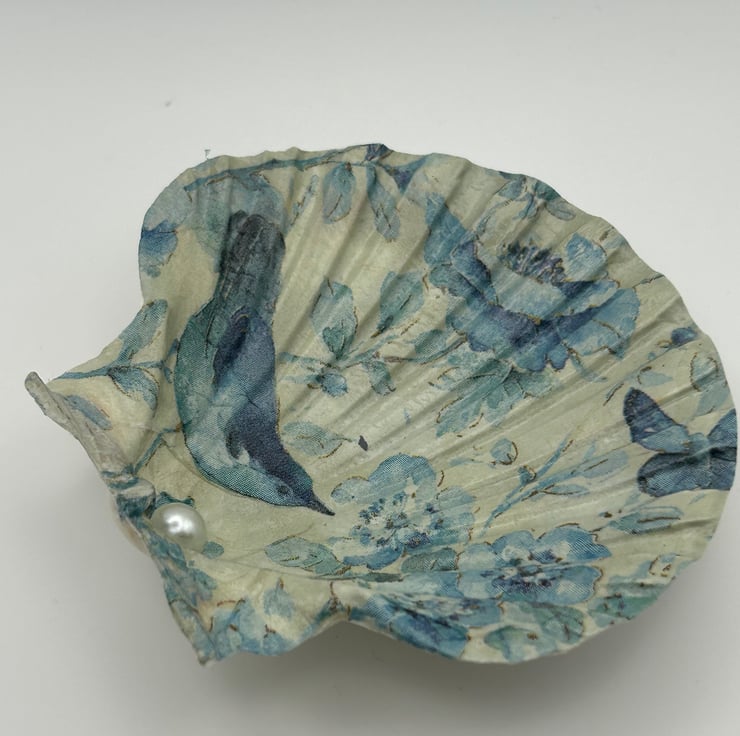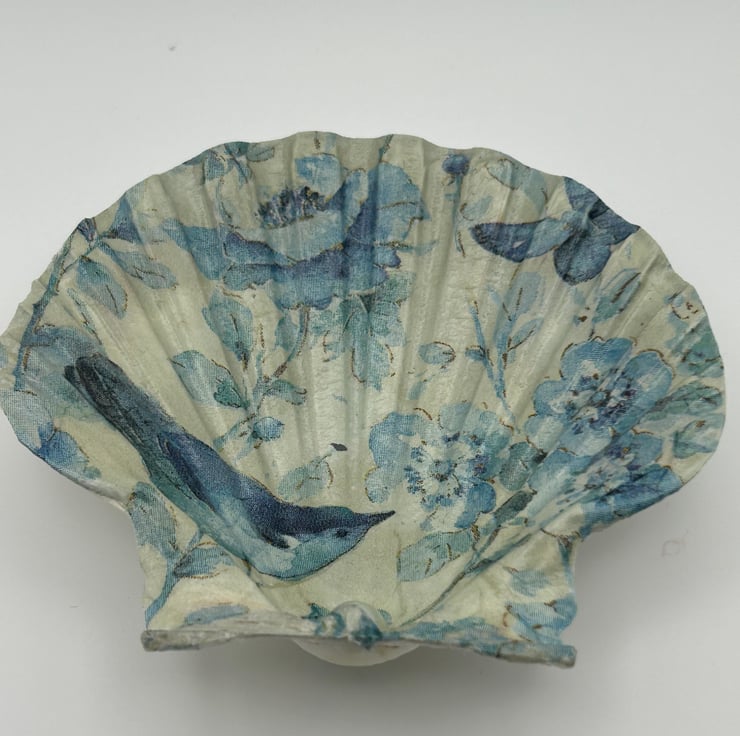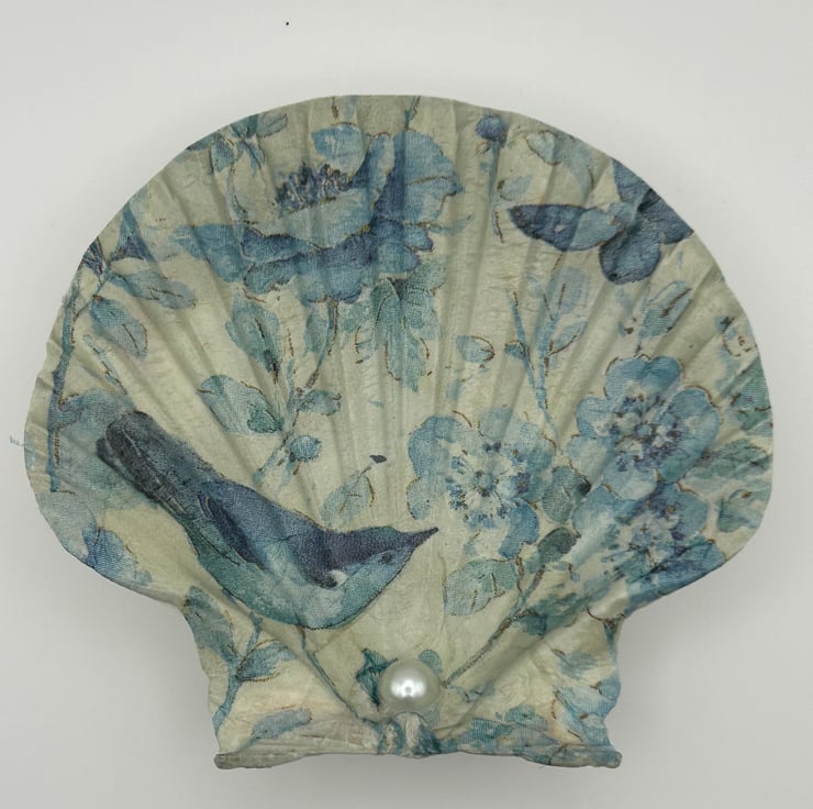 Decoupaged scallop shell finished with a protective varnish and half pearl feet. Wipe clean with a damp cloth - do not immerse in water