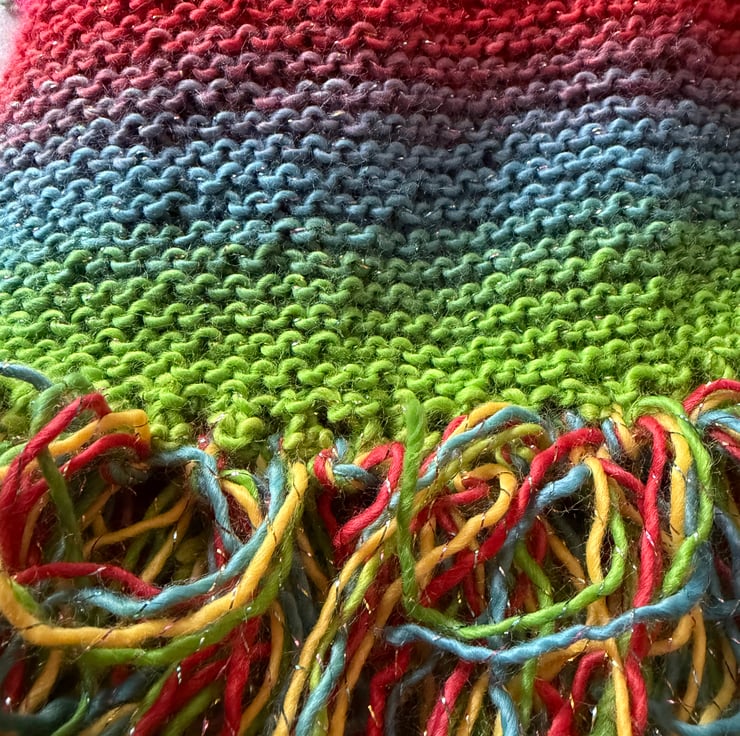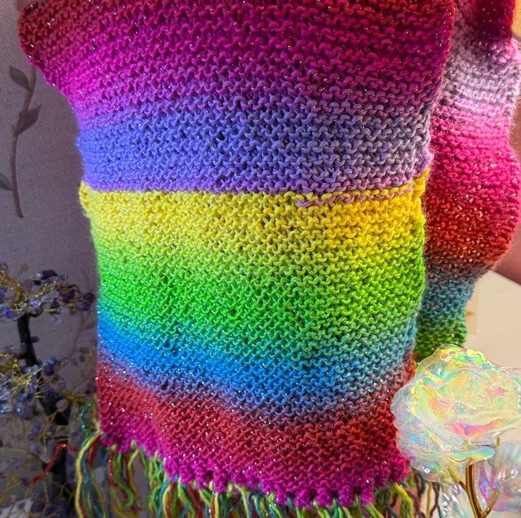 Hand knitted sparkly scarf knitted in soft, warm, beautiful, colour mix yarn with a gorgeous sparkle all the way through it, the photo’s really don’t do the sparkles justice. The fringing just finishes the scarf off and ties all the colours together.