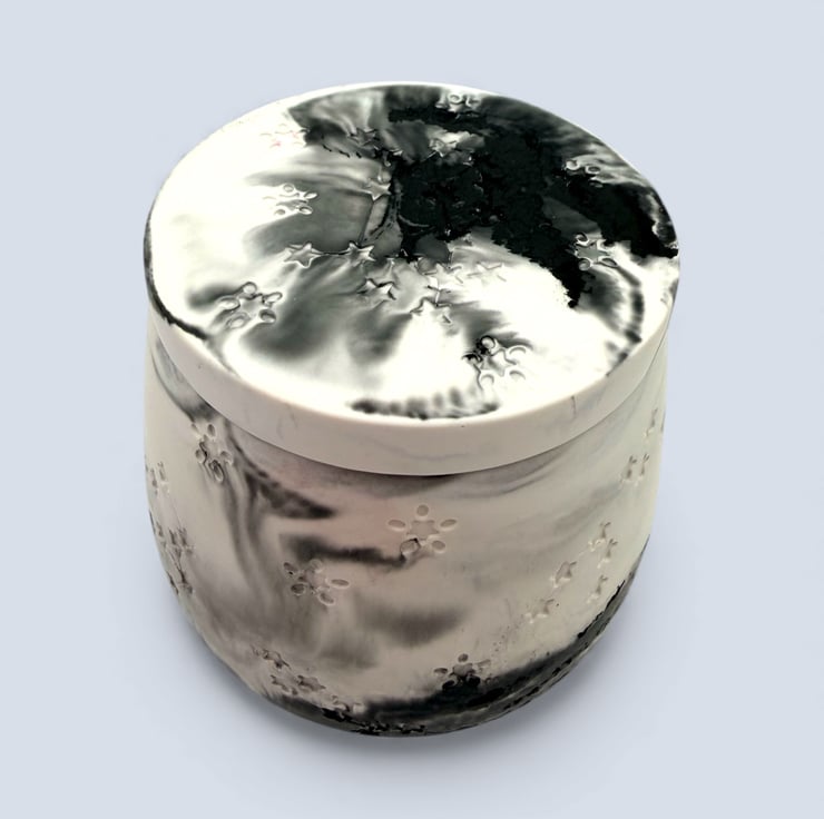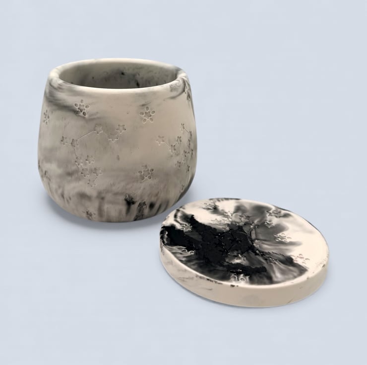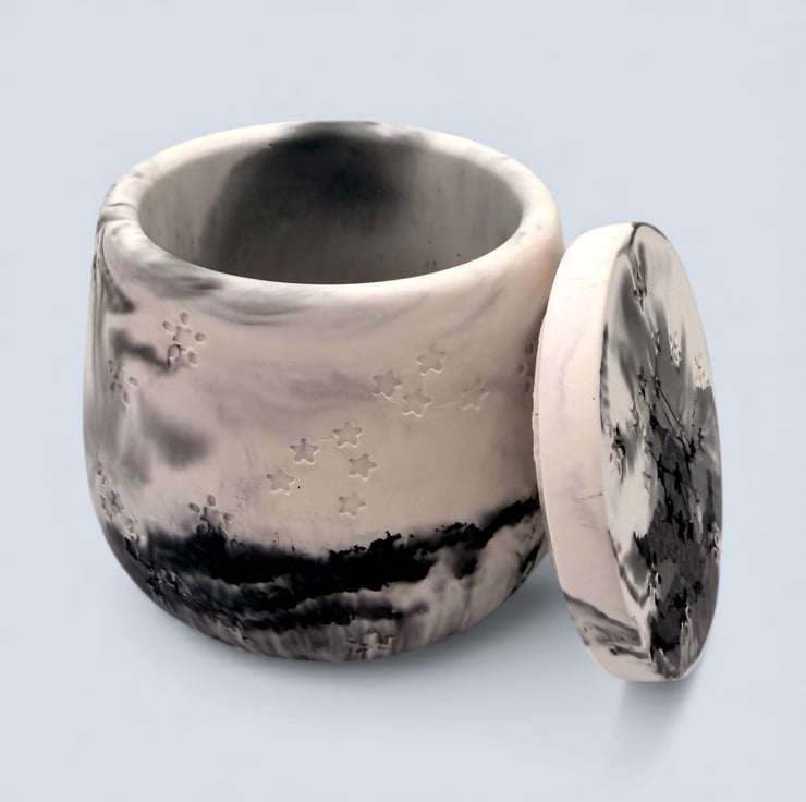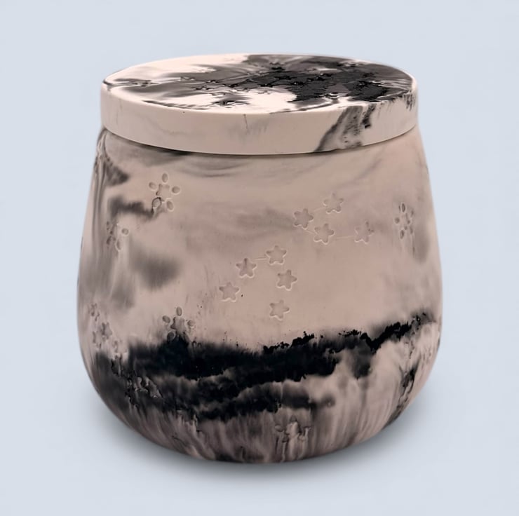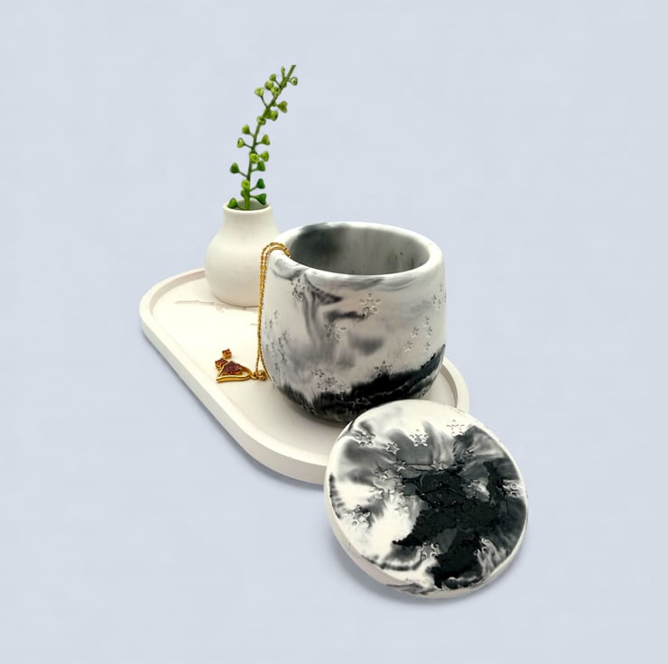 This jewellery box was inspired by quiet night skies and drifting clouds, where soft light and shadow blend together. The smoky greys and inky blacks flow naturally through the pale base, echoing the way moonlight moves across stone or mist rolls over a dark landscape.