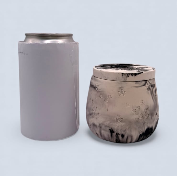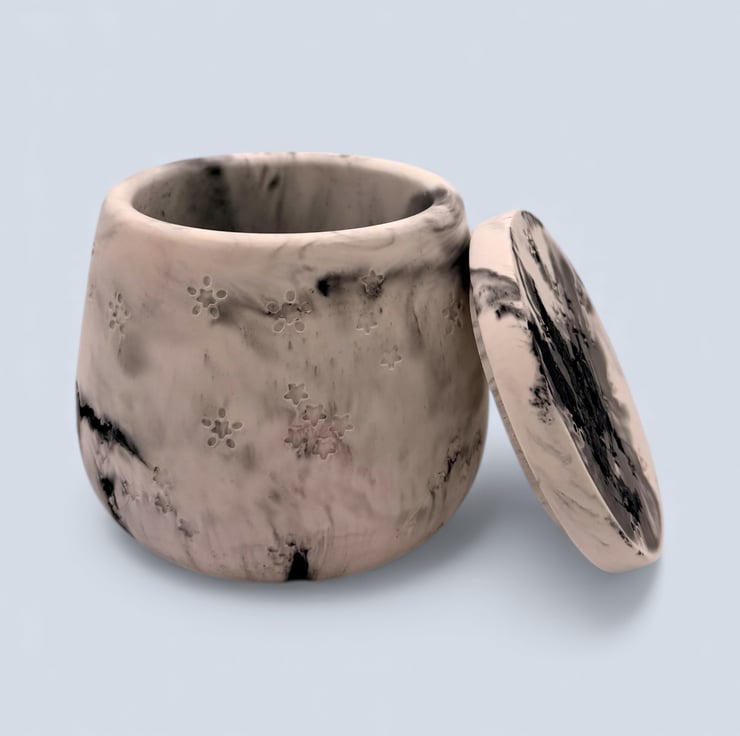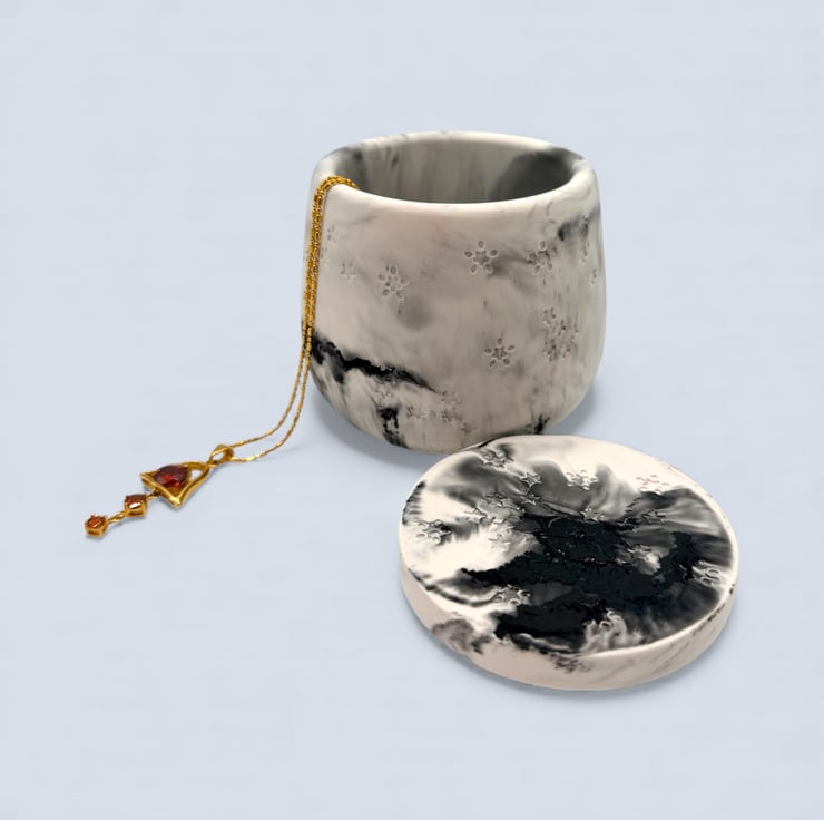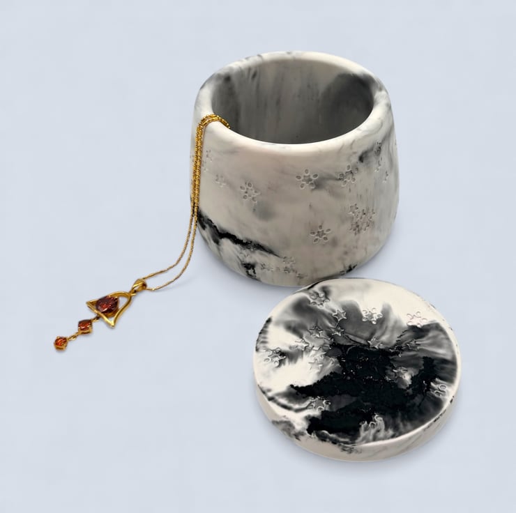 White and black marbled jewellery box with a fitted flat disc lid, designed for storing rings, earrings, necklaces and small keepsakes. The soft monochrome marbling creates a calm, stone-like look that suits modern and neutral interiors, making this a lovely gift for jewellery lovers and fans of handmade home decor.