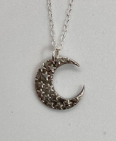 Pure silver moon necklace with embossed tiny stars which has been given an 'aged' look. On an 18" sterling silver chain.