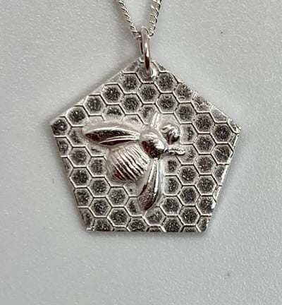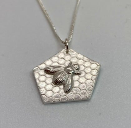 Handmade, pure silver necklace featuring a bee on a textured, honeycomb background which has been given an 'aged' look. On an 18" sterling silver chain with an adjuster at 16".