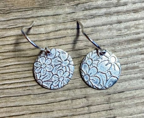 Circular, pure silver earrings with embossed flower pattern. On sterling silver ear wires.