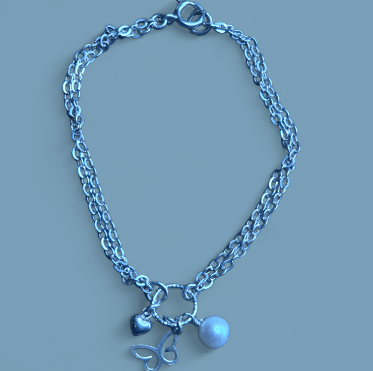 This distinctive and original bracelet features charms placed centrally on a sparkling ring. The charms have been carefully chosen for size so they each catch the eye. There is a dainty heart and a butterfly, both in sterling silver. Also a 7mm perfectly round pearl is attached, it is without flaws or blemishes. This bracelet in this photo measures 17 cm, please measure me if you would like a different length