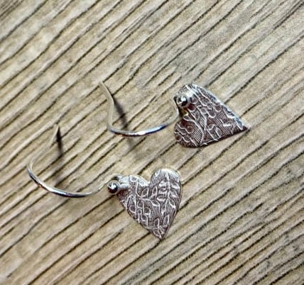 Heart shaped, pure silver earrings with delicate embossed pattern. On sterling silver ear wires.