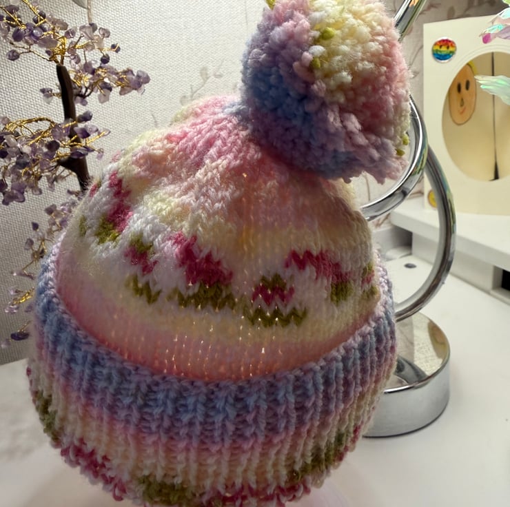 Baby’s hand knitted hat with rib and Pom pom, the very pretty multicoloured yarn forms a flower pattern making a cute baby hat.