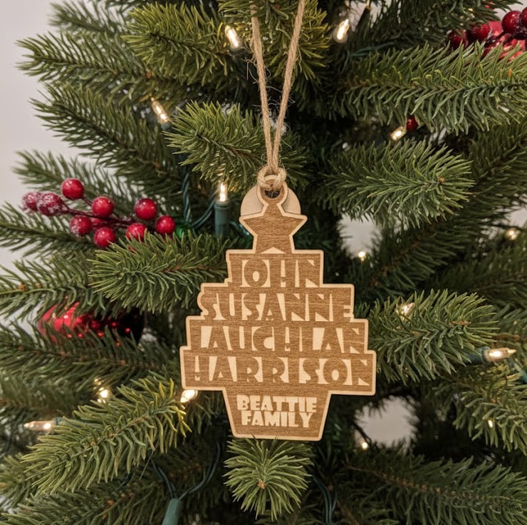 This ornament doesn’t just hang — it poses. With a star on top and a sturdy rope loop, it’s the red carpet of holiday décor. Each name stacks up like a festive pyramid scheme of love.