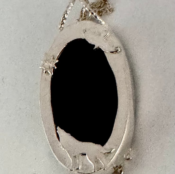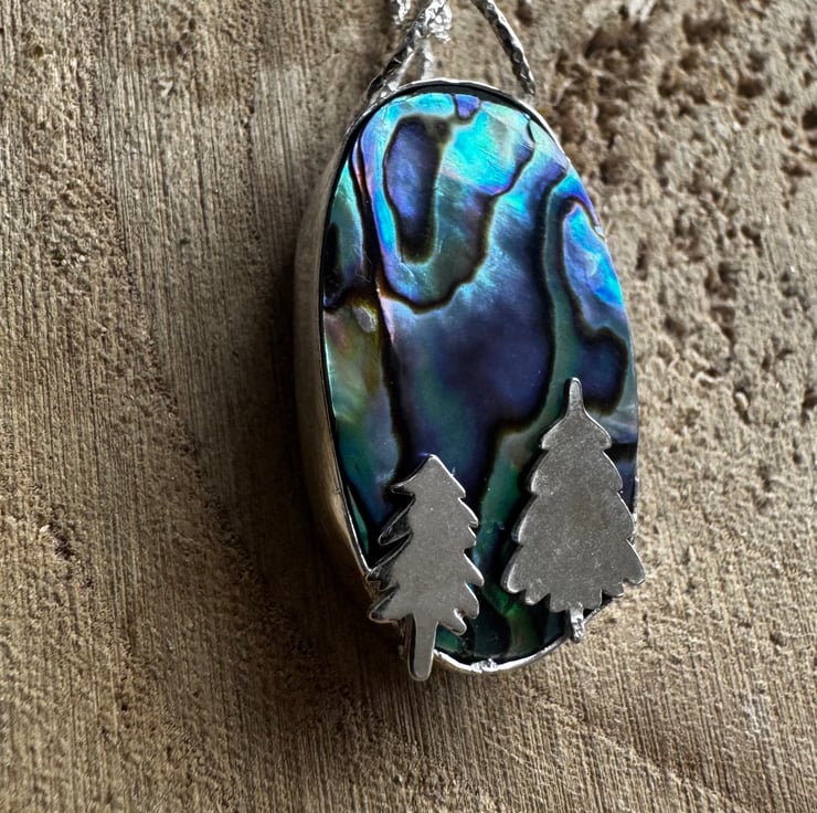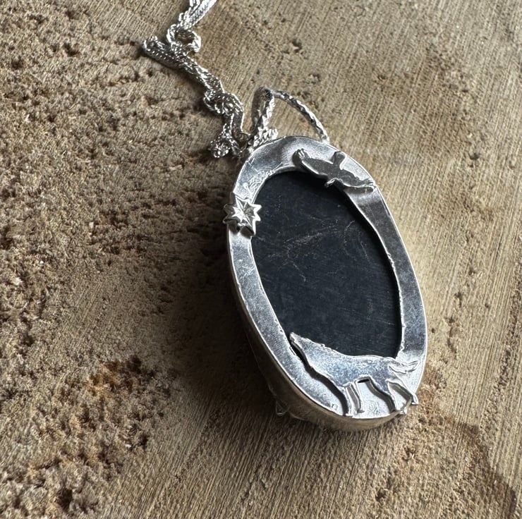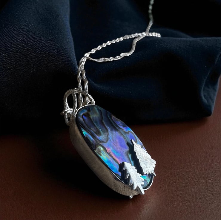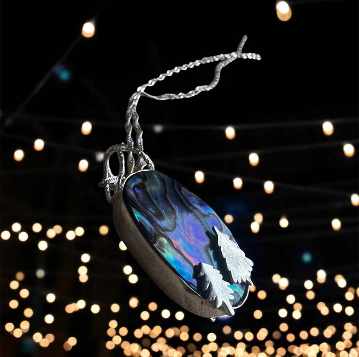 This reversible pendant is a small world of contrasts and quiet wonder. On one side, luminous abalone shell glows with shifting greens and blues, framing a gentle forest scene that feels rooted, calm and alive. Turn it over and the mood deepens: a velvety dark background holds a silver howling wolf, an eagle in flight and a single twinkling star — a moment captured under the vast night sky.