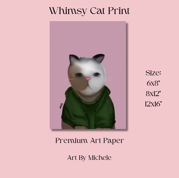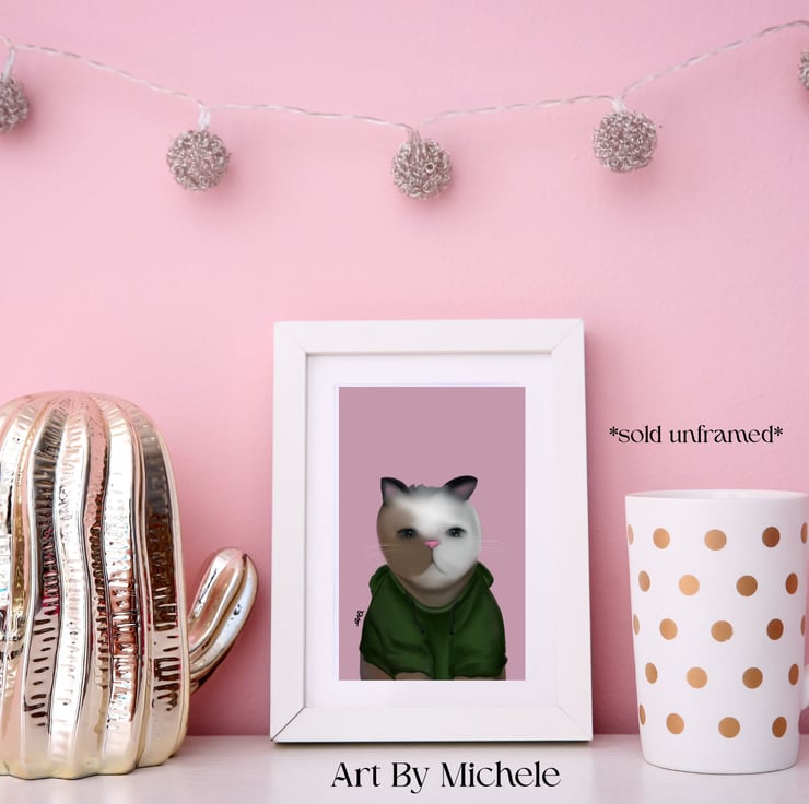 Add a playful touch to your home with this art paper print of my original hand-drawn illustration of a cat wearing a green hoodie against a vibrant pink background. This quirky and stylish artwork is perfect for cat lovers, streetwear fans, or anyone who enjoys fun, contemporary wall art.