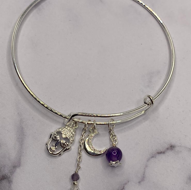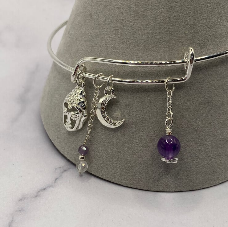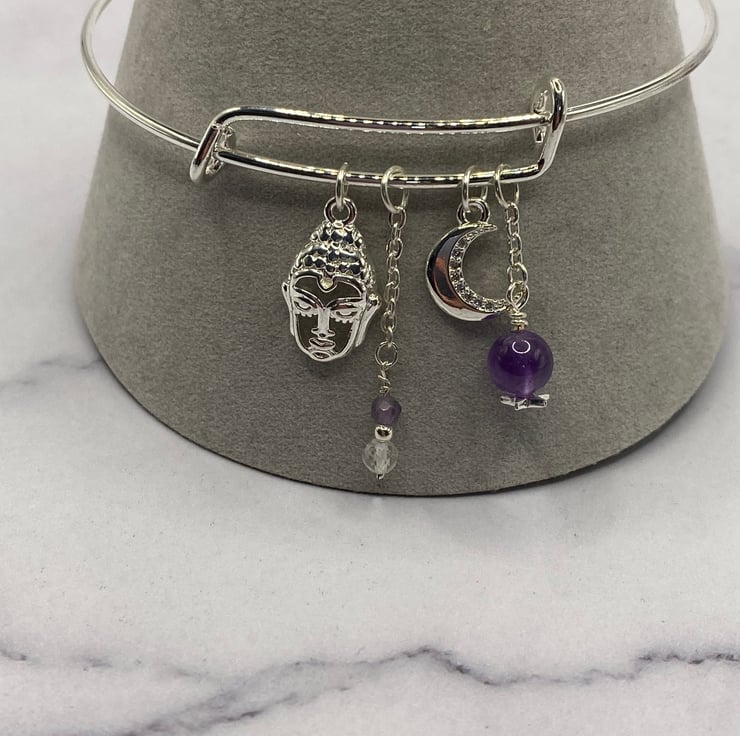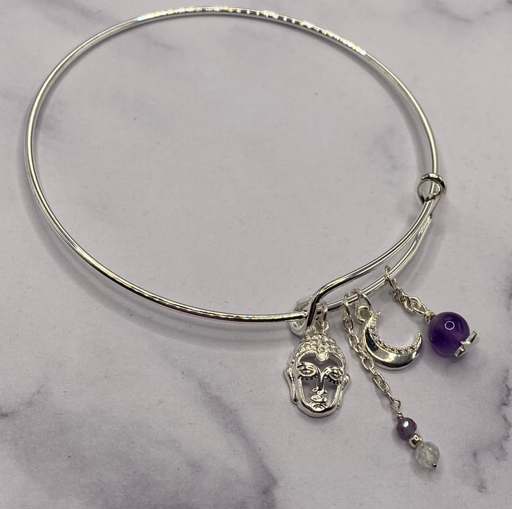 Silver plated bangle with silver plated buddha and crescent moon charms, faceted clear topaz and amethyst stones.