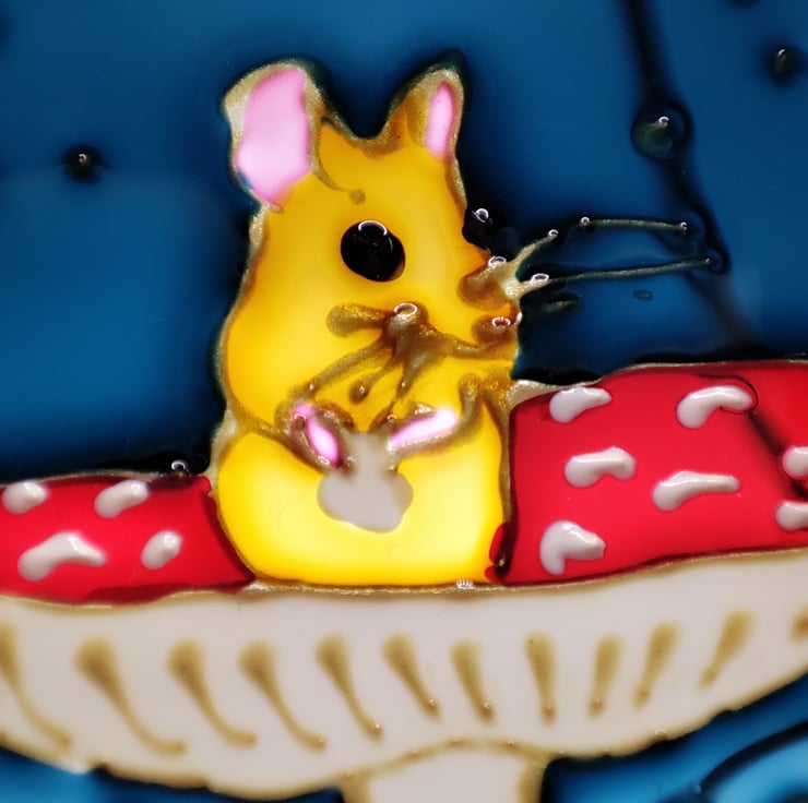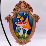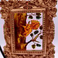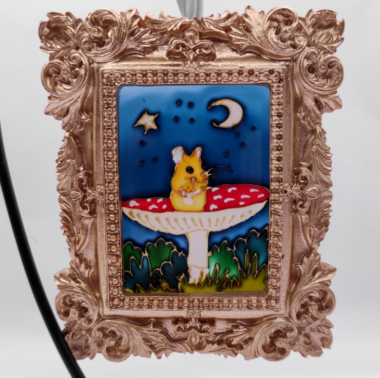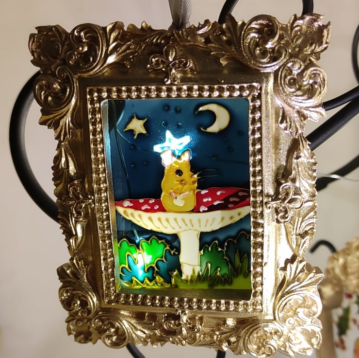 Hand painted using specialised glass paints, this mini painting with it's baroque style frame can be hung on a Christmas tree or in a window all year round.
