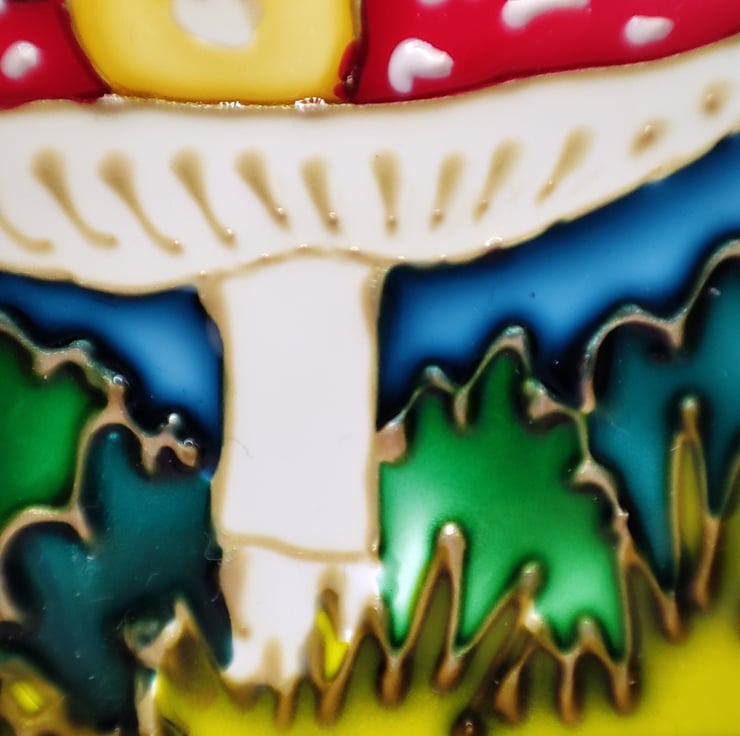 It is made from glass with a resin frame. It's approximately 10cm x 8cm