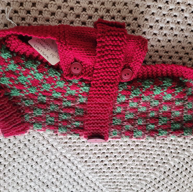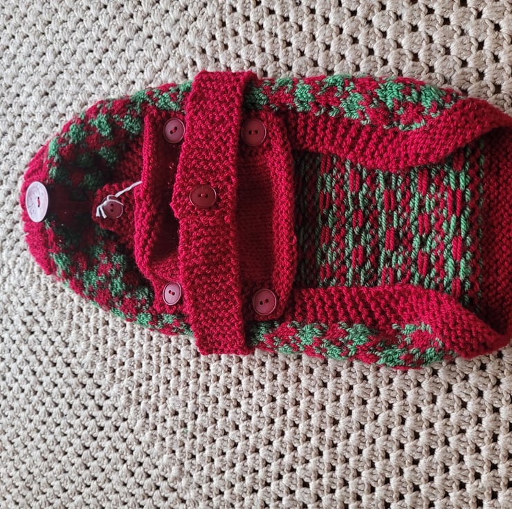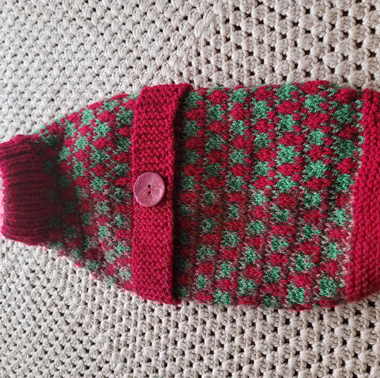 Hand knitted in cherry red and green. Size s. Length 13 inches, chest15 inches. Suitable for male or female dogs. Machine washable on low.