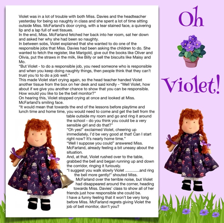 There are other children in Maisy’s class at school - Violet, Billy with his pet rabbit, Amber, Tilly, Rosie and her kittens, Amelia, Ruby, Marigold, Bobby with Max the dog, and the twins Oliver and Olivia, who have a puppy called Oscar. The dolls are all 26cm tall and baby Daisy is 16cm. Maisy and Mo love nothing more than having adventures with their friends. You can read about their adventures on my Facebook and Instagram pages - Maisy Muffin Rag Dolls and on my Mulberry Green Pinterest boards.