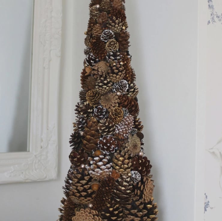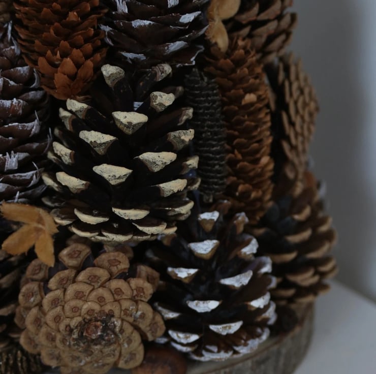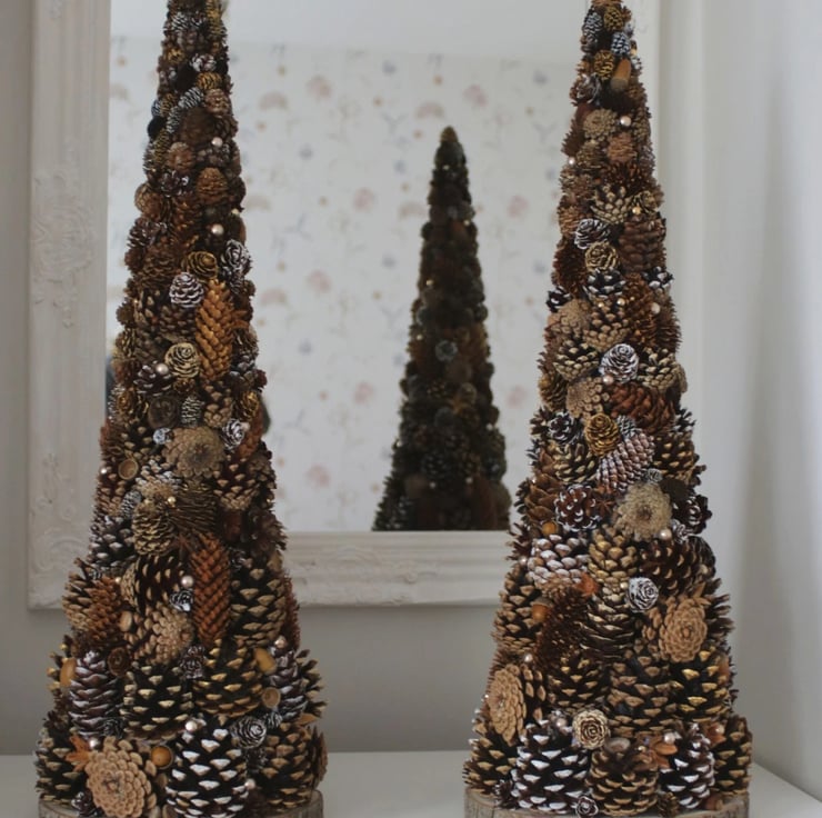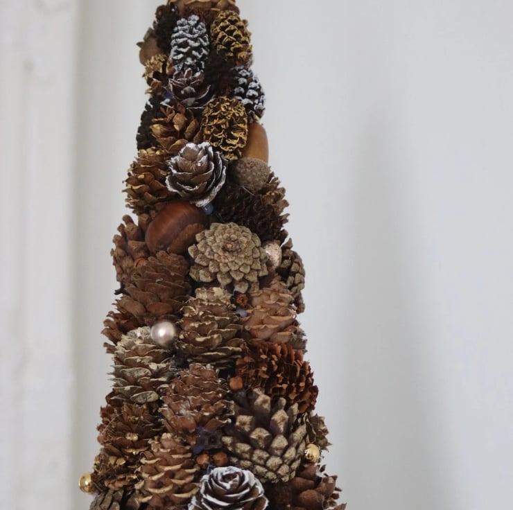 - Handmade natural tabletop pinecone trees with a stable stand at the bottom. Crafted with all biodegradable materials - real acorns, pinecones, and other natural elements. Perfect as a festive centrepiece for your dining table or a charming decoration for your fireplace mantel.