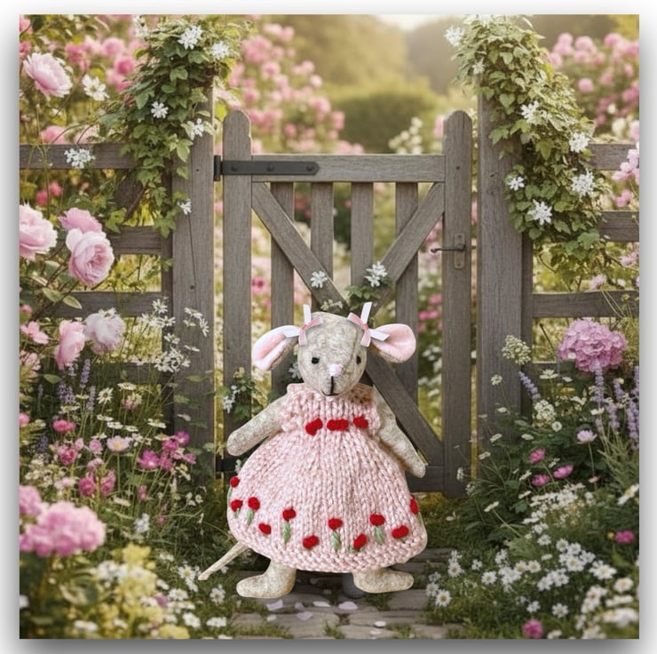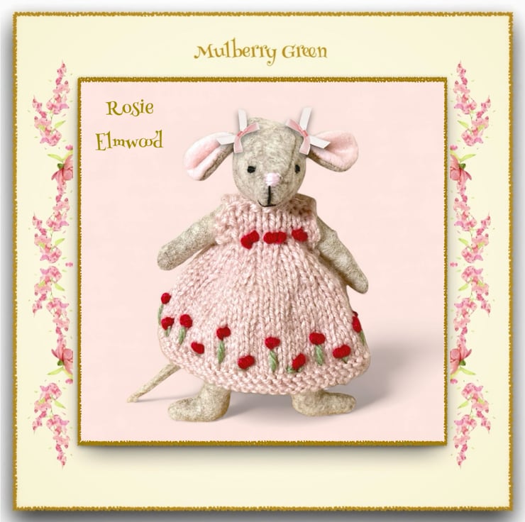 Rosie Elmwood, in her pale pink embroidered dress and matching bows, is a Pip Squeak, a young Little Nipper. Little Nippers are tiny wood mice who live in a maze of tunnels underneath the barn at Mulberry Farm. All of the Little Nippers are named after herbs and meadow flowers. Pip Squeaks are 11cm tall. Clothes made especially to fit them are also available in my shop.