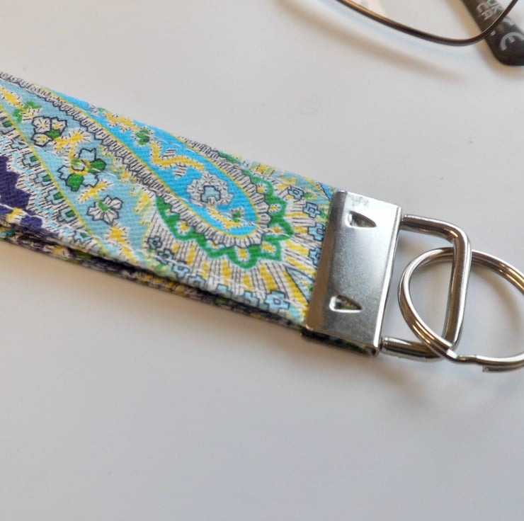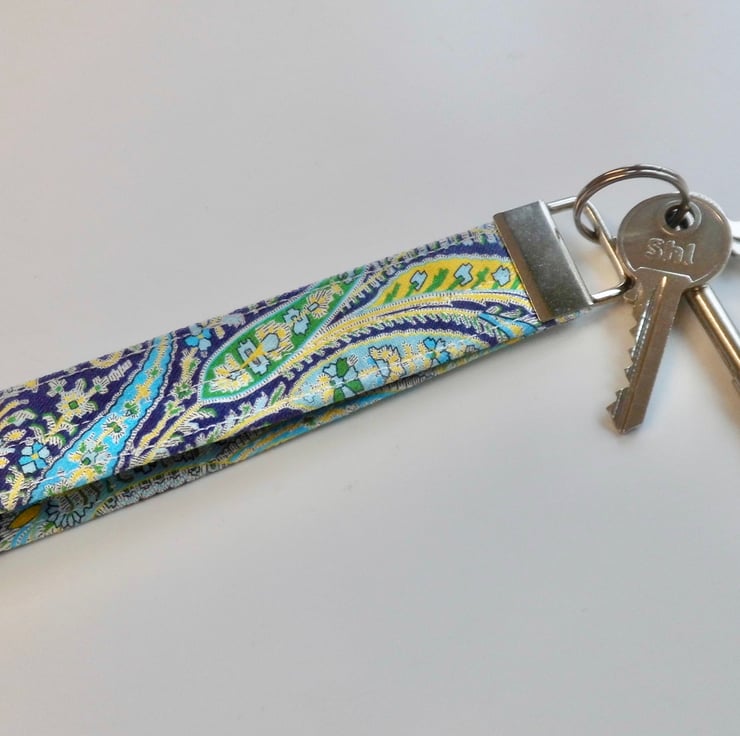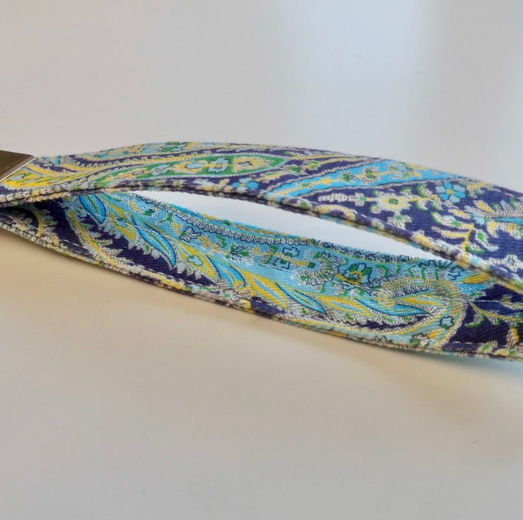This wrist strap key fob is made using a gorgeous Liberty paisley print fabric called Felix and Isabelle in beautiful blues and greens. Top stitched at the edges and down the centre with ivory thread.