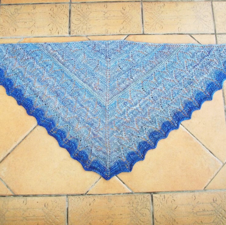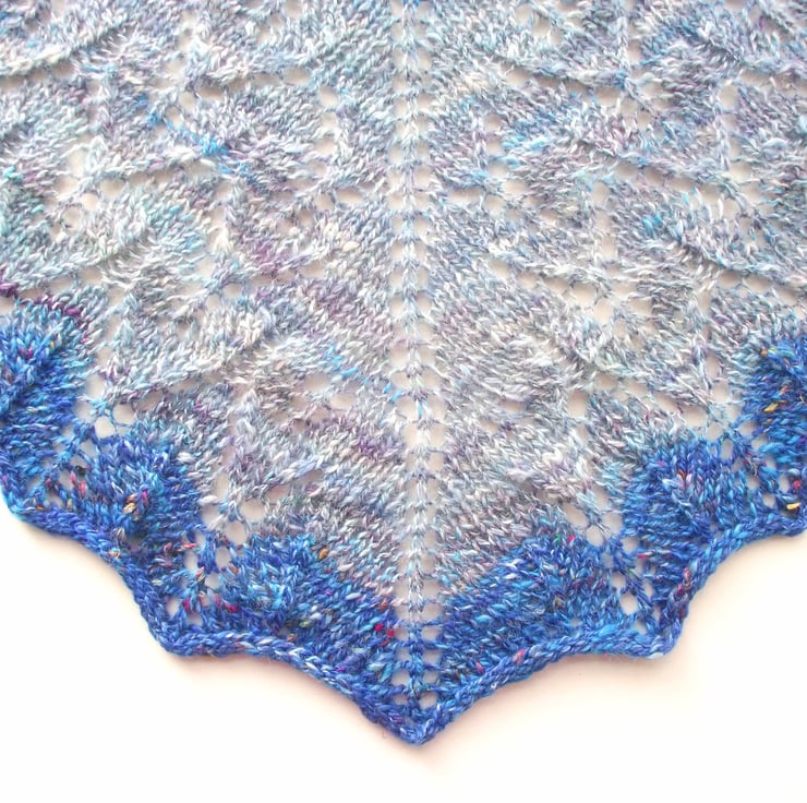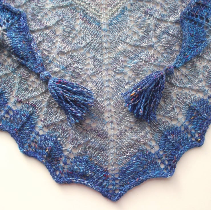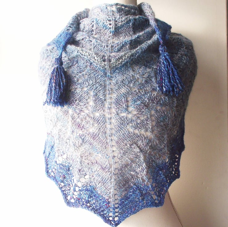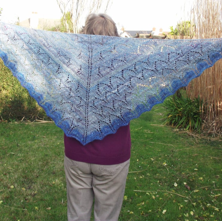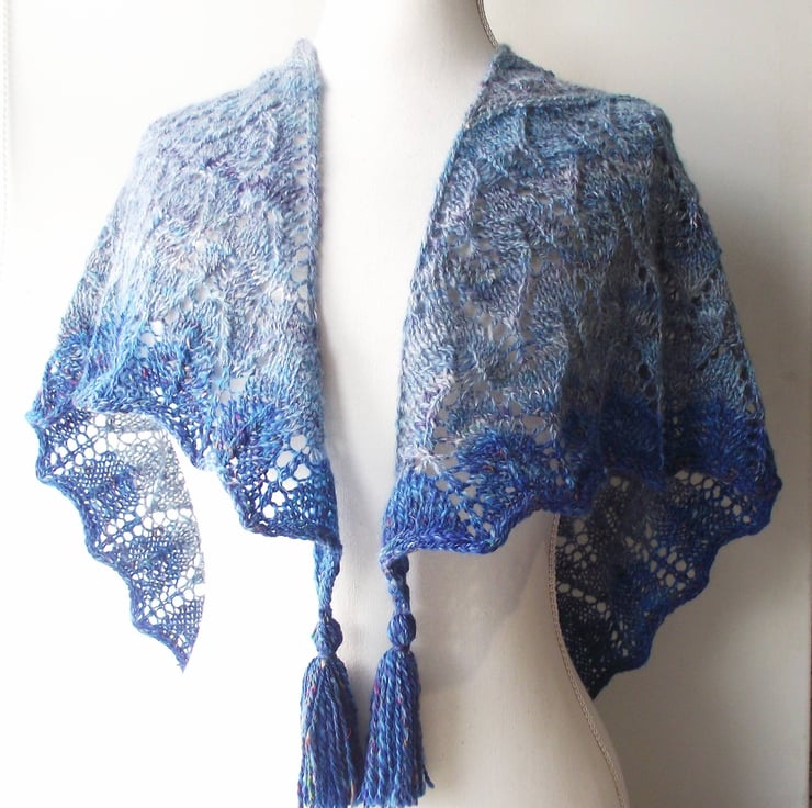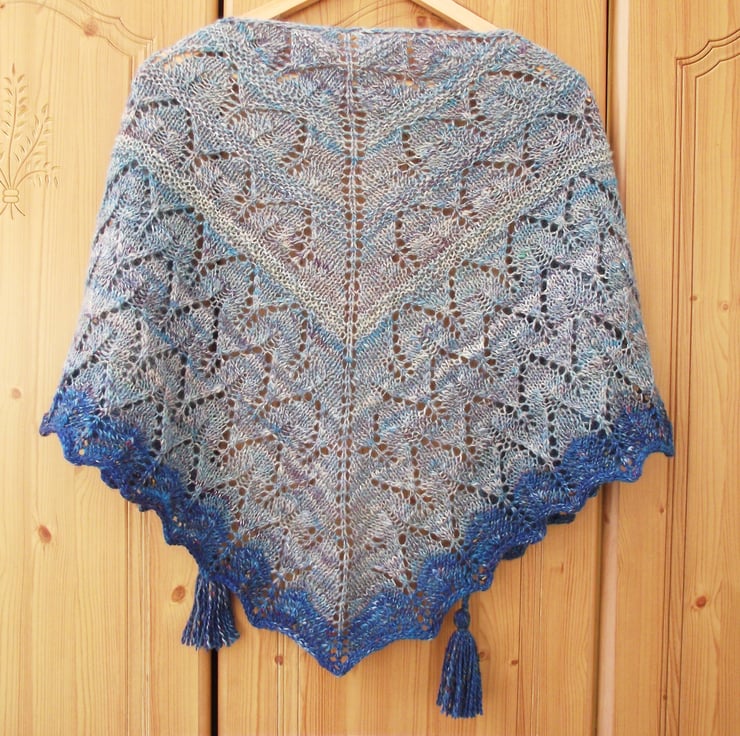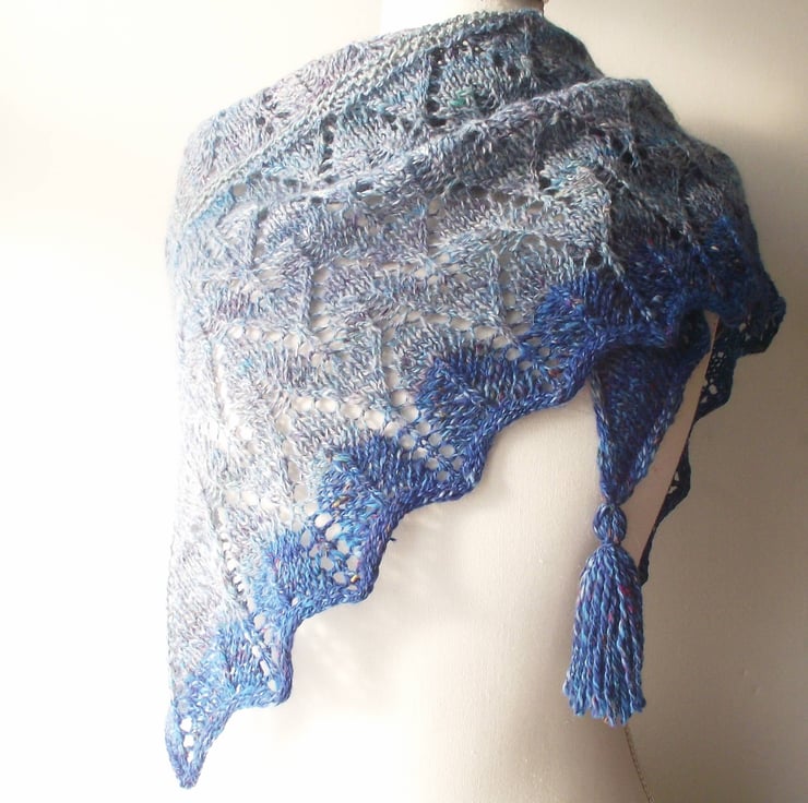 This lacy shawl is truly exclusive to Wonderwoollens. Firstly, I blended several shades of blue merino wool, together with shiny white bamboo, then I handspun this blend into a lightweight yarn. Then I blended some darker shades of blue merino with some recycled sari silk in multiple colours and handspun this blend into another yarn. I then knitted this shawl to my own design, using the first, paler yarn for the main part and adding a border and tassels in the darker yarn.