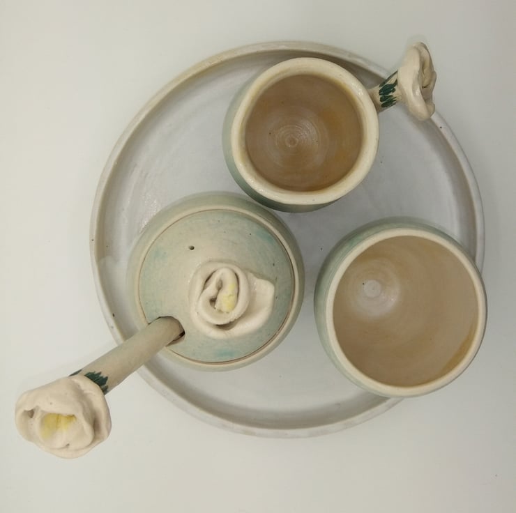 Thrown on the wheel & altered. Some flowers & buds hand formed. Milk, beaker & sugar set.