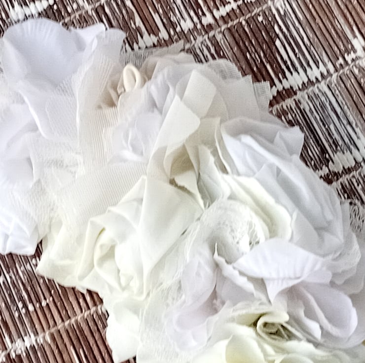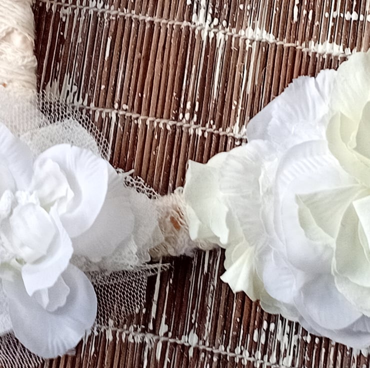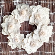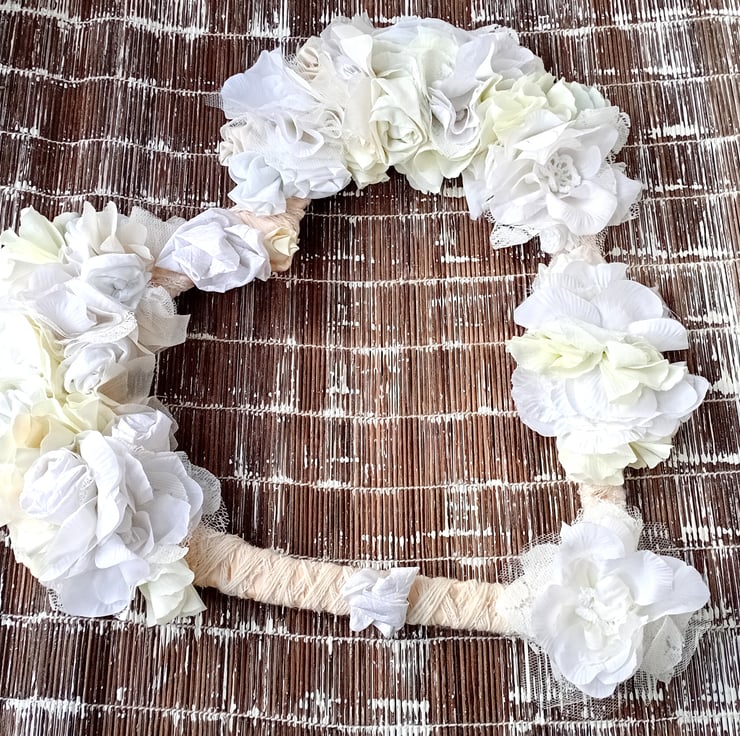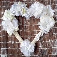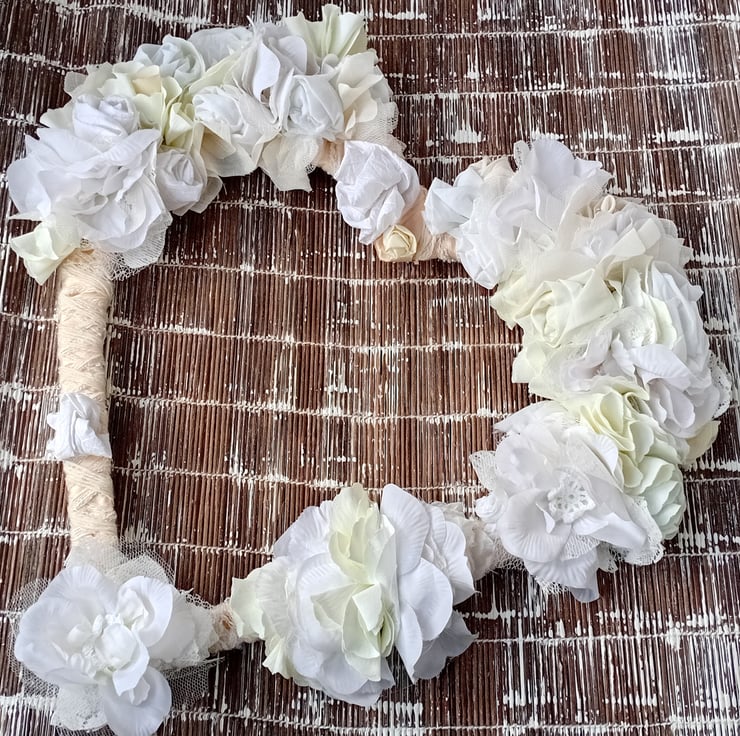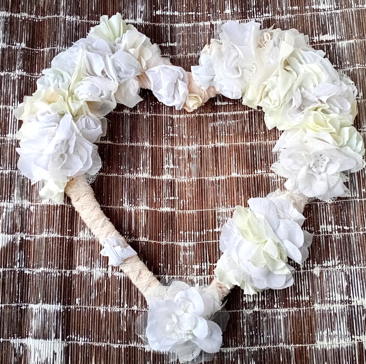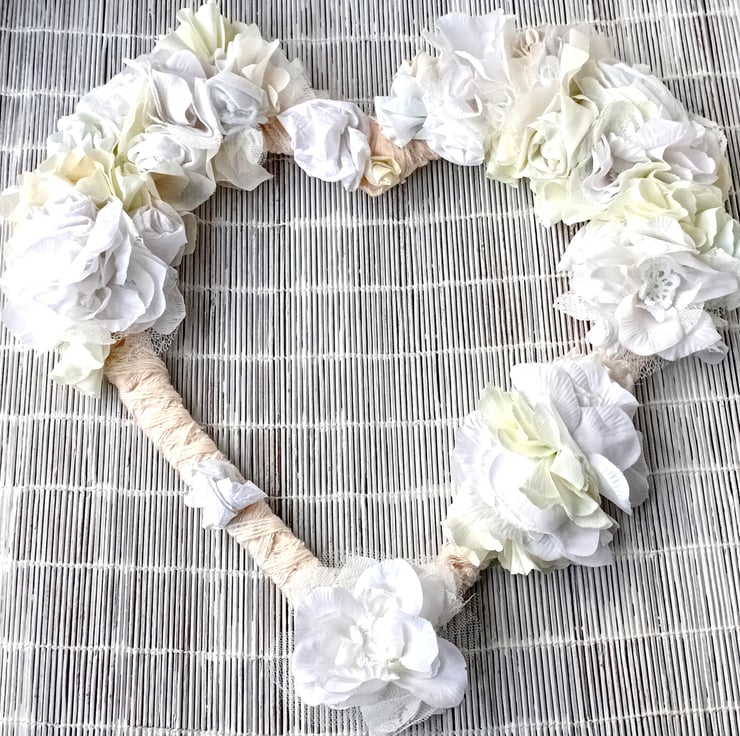 Large Heart shaped wreath of white, fabric flower petals arranged loosely around a cream, white and ivory padded fabric, ribbon and wool covered heart shaped wire frame.