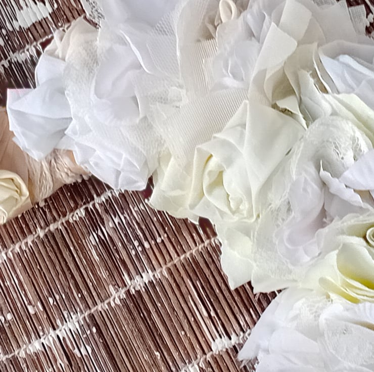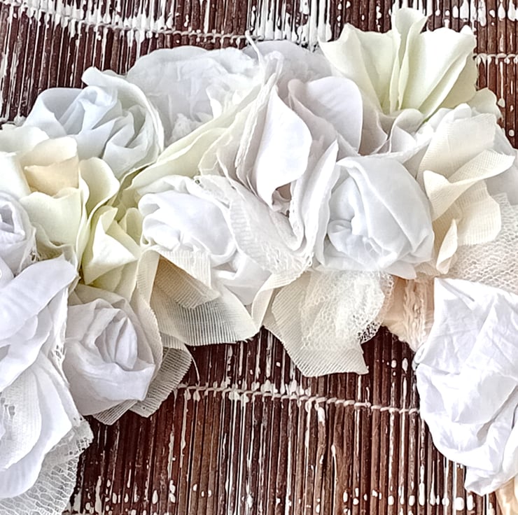 Layers of 'flowers and petals' made from a variety of fine, textured and smooth, soft fabrics, cotton, net and ribbon with lace additions arranged around the heart frame.