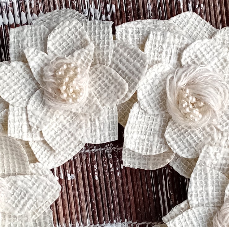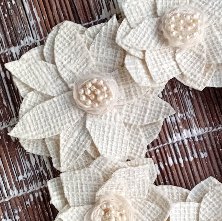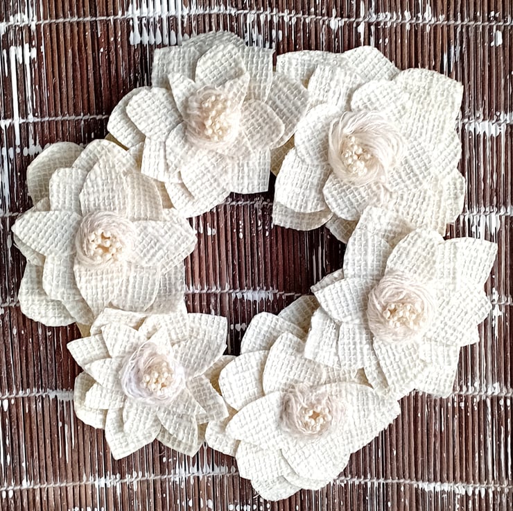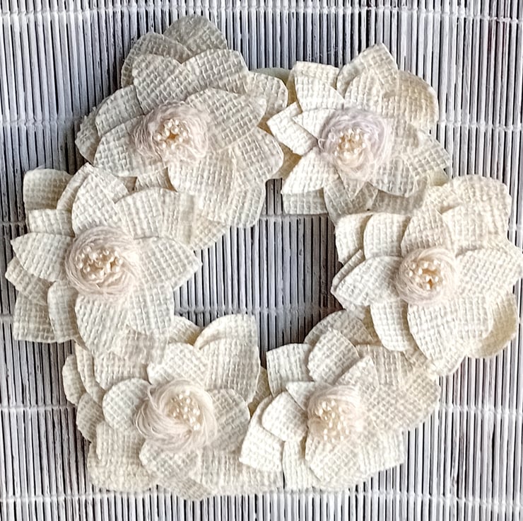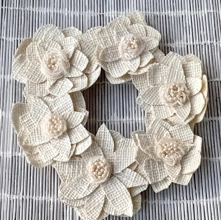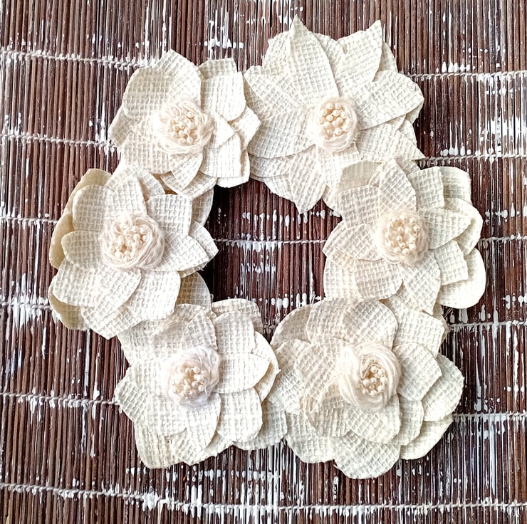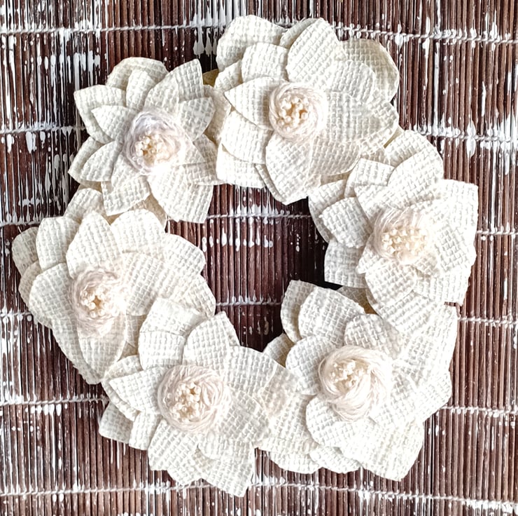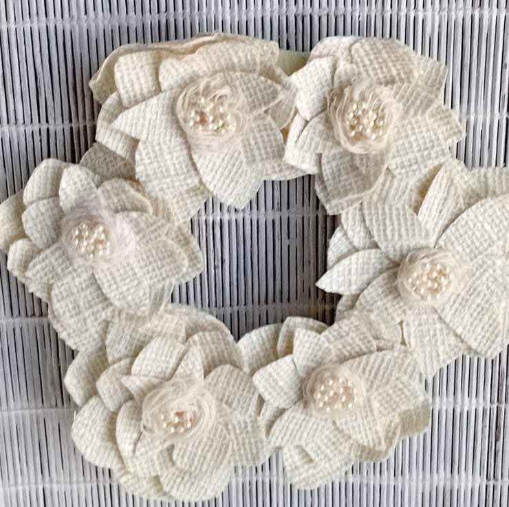 A collection of 6 stiffened, textured cream fabric 'flowers' with centres of ivory wool and white pearlescent beads are placed round the frame. The frame is padded and covered in pale creamy yellow painted fabric wound round the wire frame.
